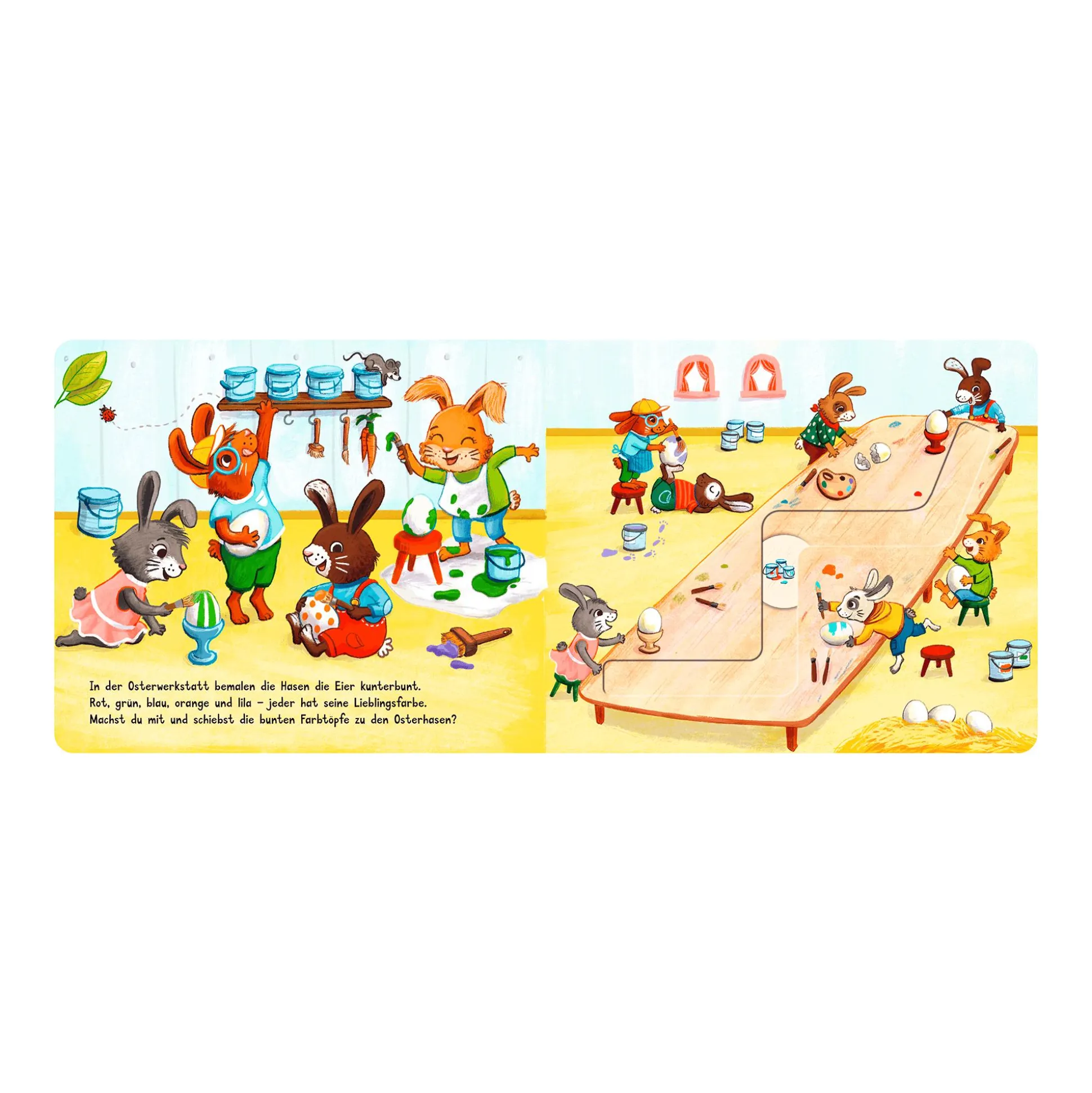 Ostern steht vor der Tür und wie jedes Jahr haben die Hasen und Hühner ganz schön viel zu tun. Mit dieser tollen Mitmachpappe können schon die Allerkleinsten tatkräftig dabei unterstützen.Schieben, spielen und staunen mit den fleißigen Häschen. Machst du mit? Mit den großen Schiebe-Elementen auf jeder Seite können Kinder Ostereier einsammeln, sie in der Osterwerkstatt kunterbunt bemalen und in dem Bollerwagen über die große Wiese schieben – viel Spaß beim Ostereiersuchen!