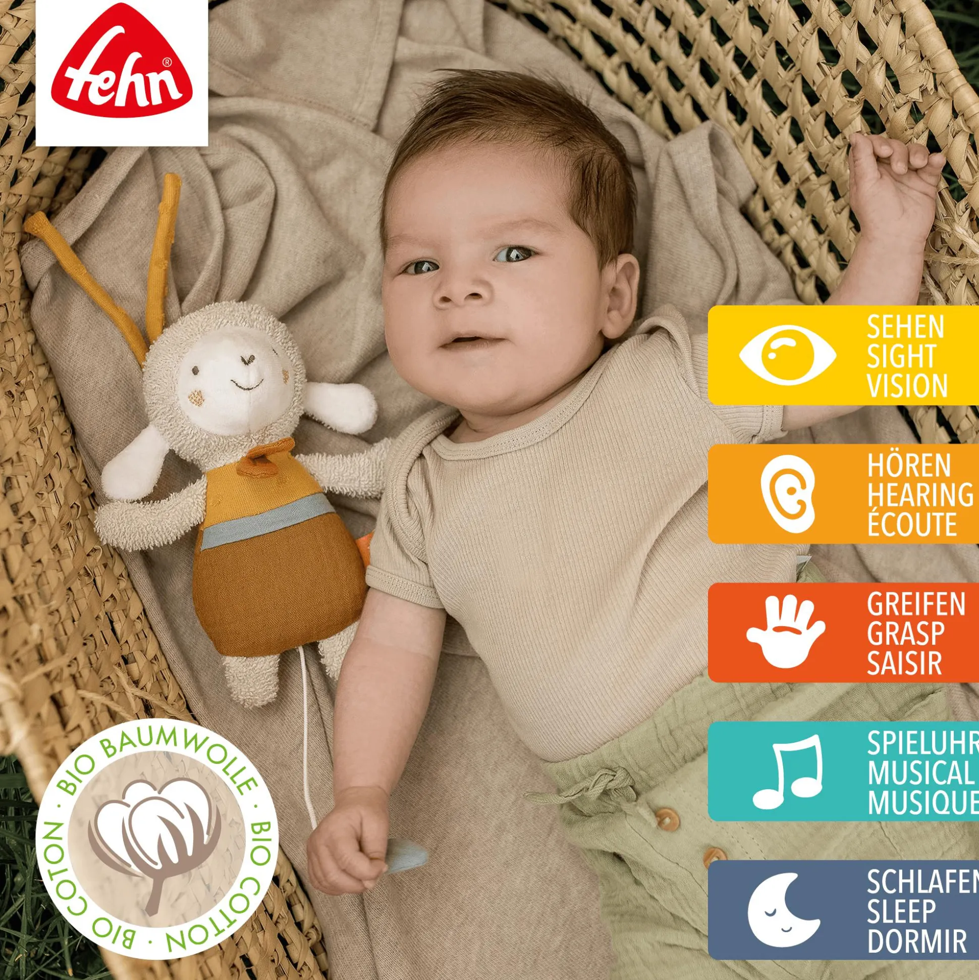 Damit das Schaf lange Zeit Freude bereitet, sollte die Spieluhr vor dem Waschen entnommen werden. Der Reißverschluss kann nur von Erwachsenen betätigt werden. Die Mini-Spieluhr besteht aus hochwertigen Materialien wie Frottee, Musselin, Jersey und Nicki, die allesamt aus Bio-Baumwolle gefertigt sind. Diese natürlichen Stoffe sorgen für ein angenehmes Gefühl auf der Haut und sind besonders schonend, sowohl für die Kleinen als auch für die Umwelt. Die Füllung der Spieluhr besteht ebenfalls aus Bio-Baumwolle.