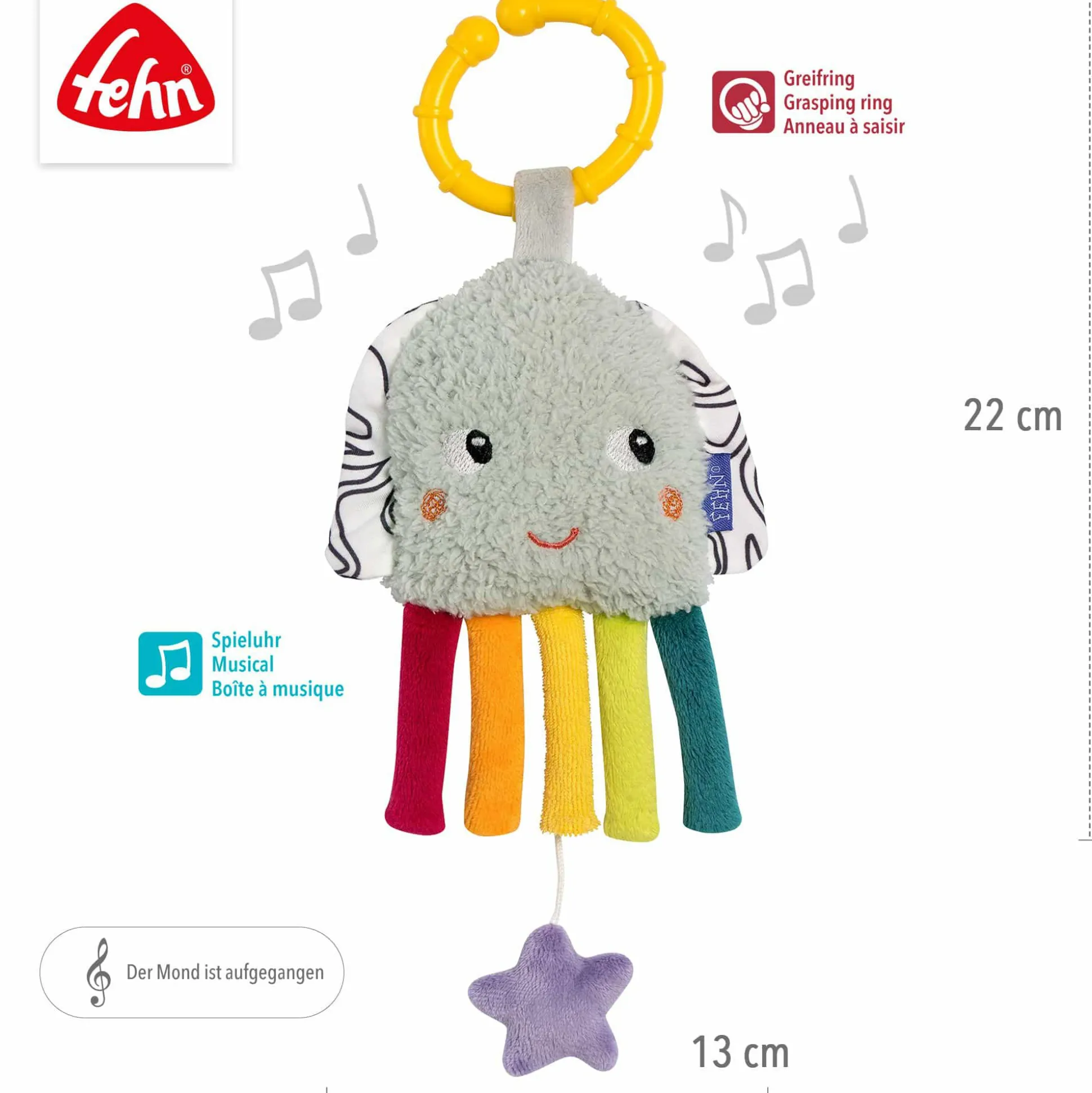 Das mehrfarbige Design mit seinen weichen, unterschiedlichen Texturen lädt dein Baby zum Entdecken und Fühlen ein. Die fröhlichen Farben wecken die Neugier und fördern spielerisch die Sinne. Mit dem praktischen Befestigungsring lässt sich die Spieluhr überall ganz einfach an Kinderwagen, Babyschale oder Bettchen anbringen – so begleitet sie deinen Schatz überall hin.