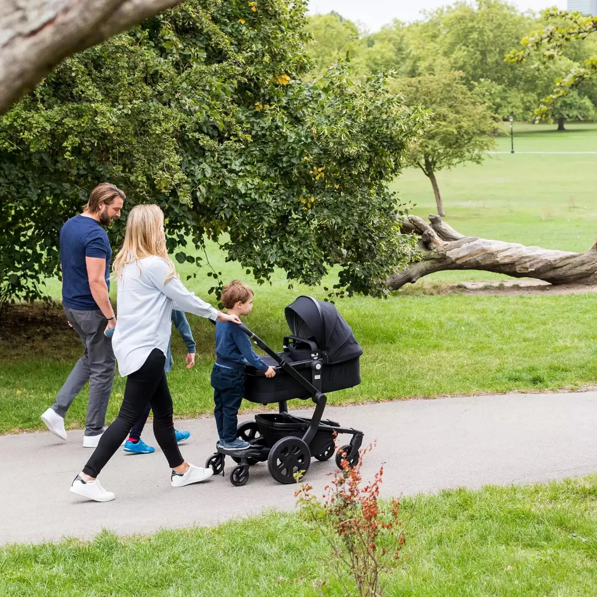 - mit 2 kindern unterwegs – Mitfahrbrett einfach am Kinderwagen festklicken und schon können alle mit