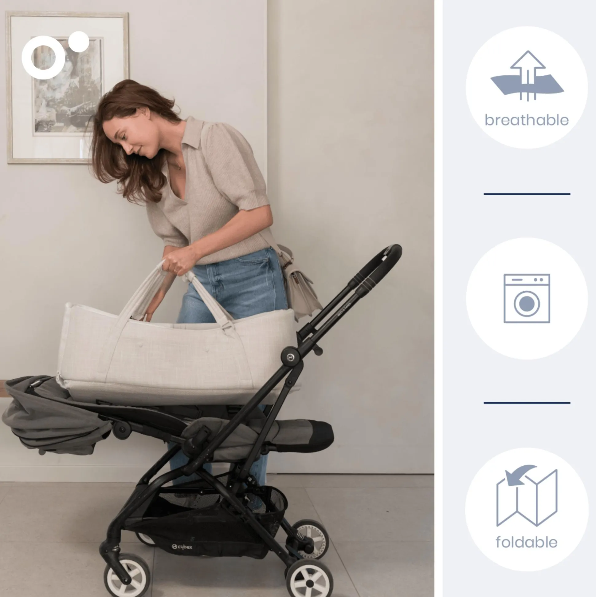 Doch das Nestchen ist nicht nur super bequem, sondern auch extrem funktional: Es lässt sich leicht im Kinderwagen befestigen oder passt in die Babyschale. Zudem ermöglicht die integrierte Öffnung ein unkompliziertes Windelwechseln. Dank seiner zwei Griffpositionen und des leichten Designs kannst du es mühelos transportieren. Und wenn du es gerade nicht brauchst, lässt es sich kompakt zusammenfalten und in der mitgelieferten Tragetasche verstauen.