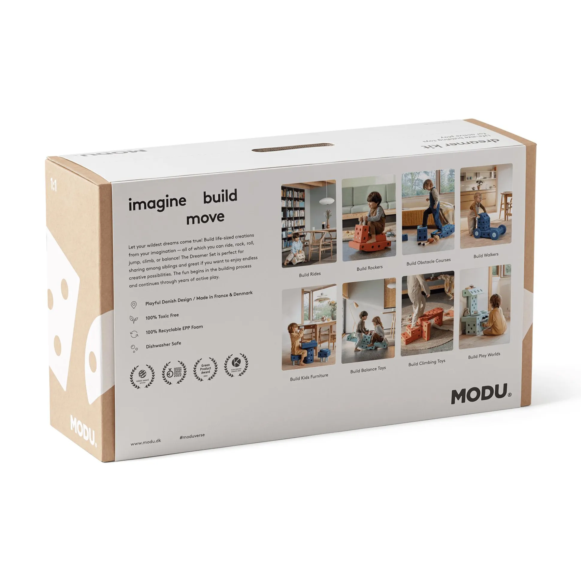 Das MODU Dreamer Set lässt die Träume deines Kindes wahr werden: Mit diesem faszinierenden Bauset, bestehend aus 34 Teilen, können mehr als 25 einzigartige, lebensgroße Spielzeuge und Kreationen erschaffen werden. Die Teile ermöglichen fantasievolles Spielen und fördern die Kreativität deines kleinen Abenteurers.