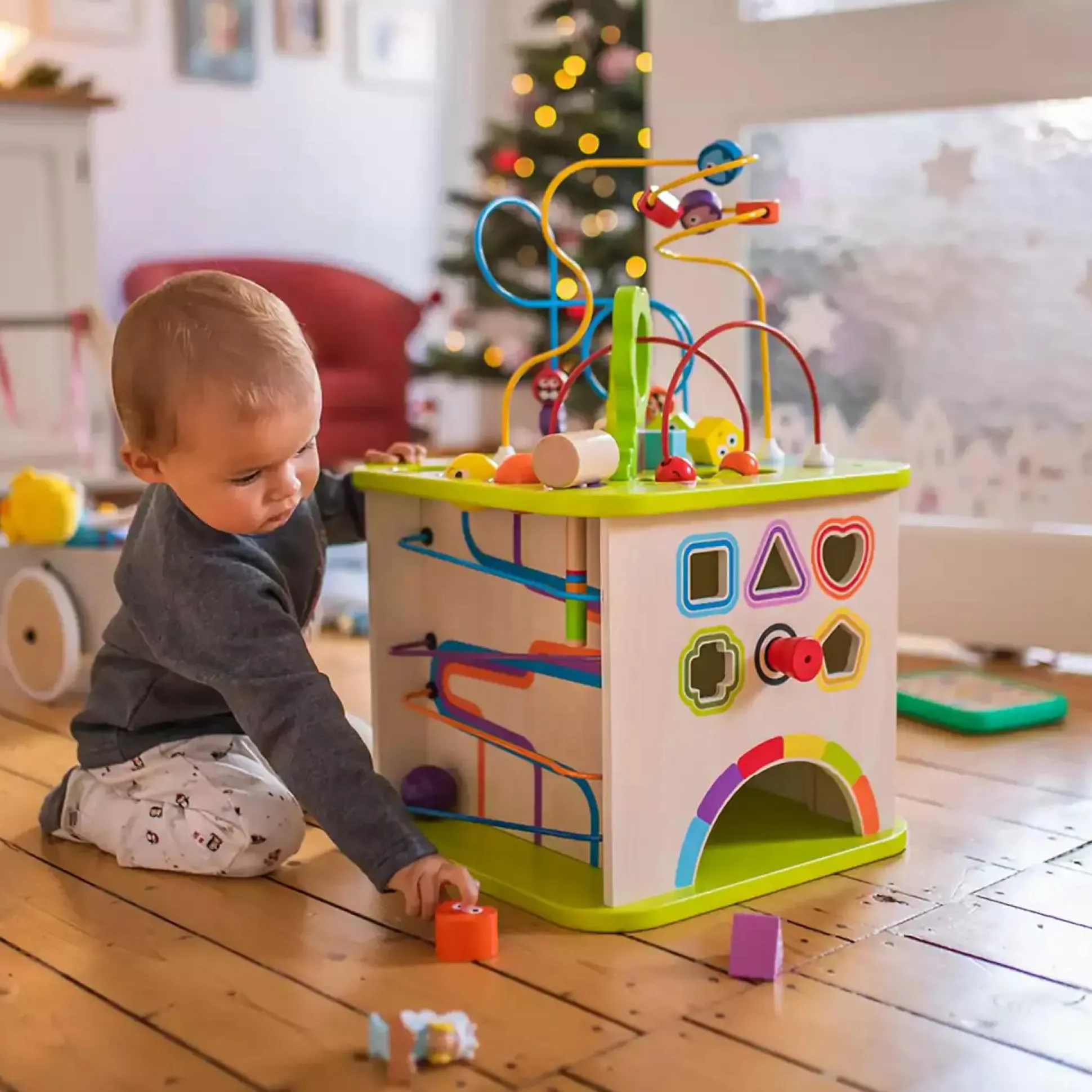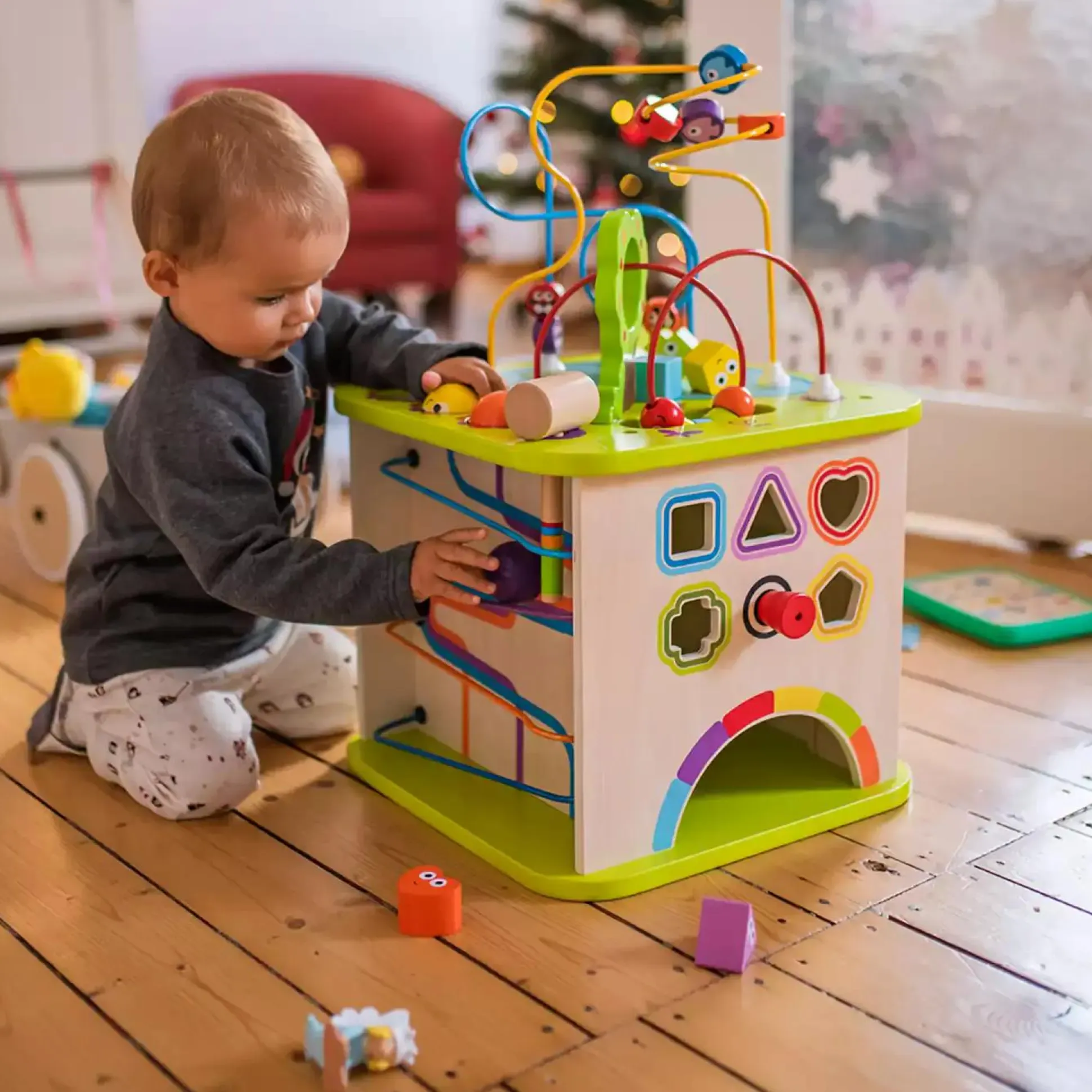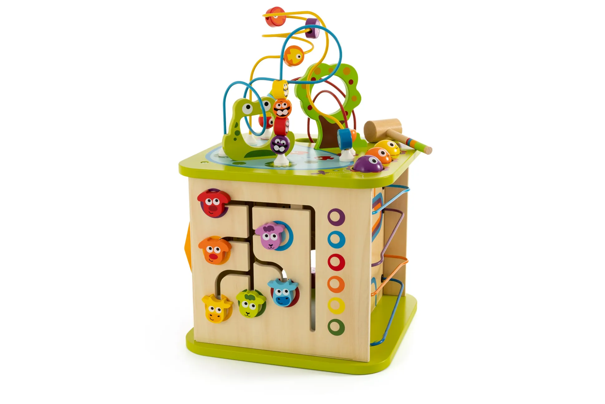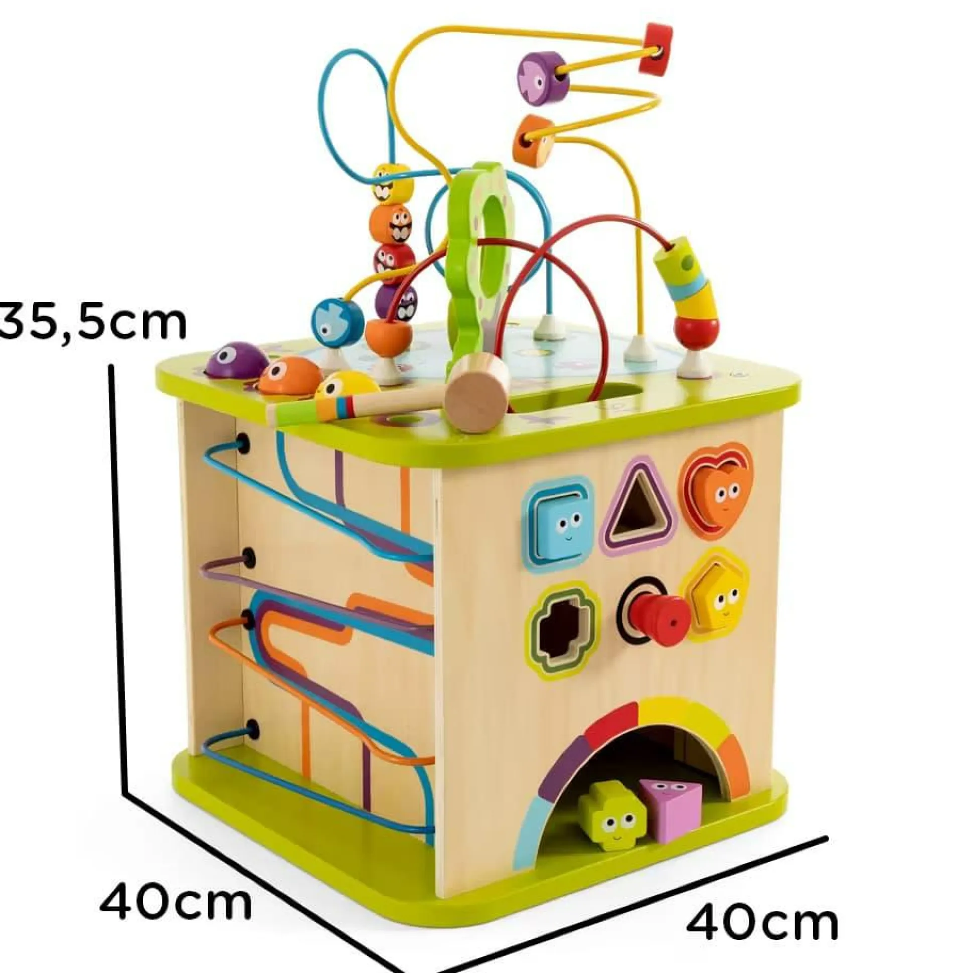- Kinder können die bunten Kugeln durch das Labyrinth lenken, die Farben der Würfel benennen, Tiere zählen, Teile nach Form, Farbe und Größe sortieren, und Begriffe wie „auf, unter, drinnen und draußen“ kennenlernen