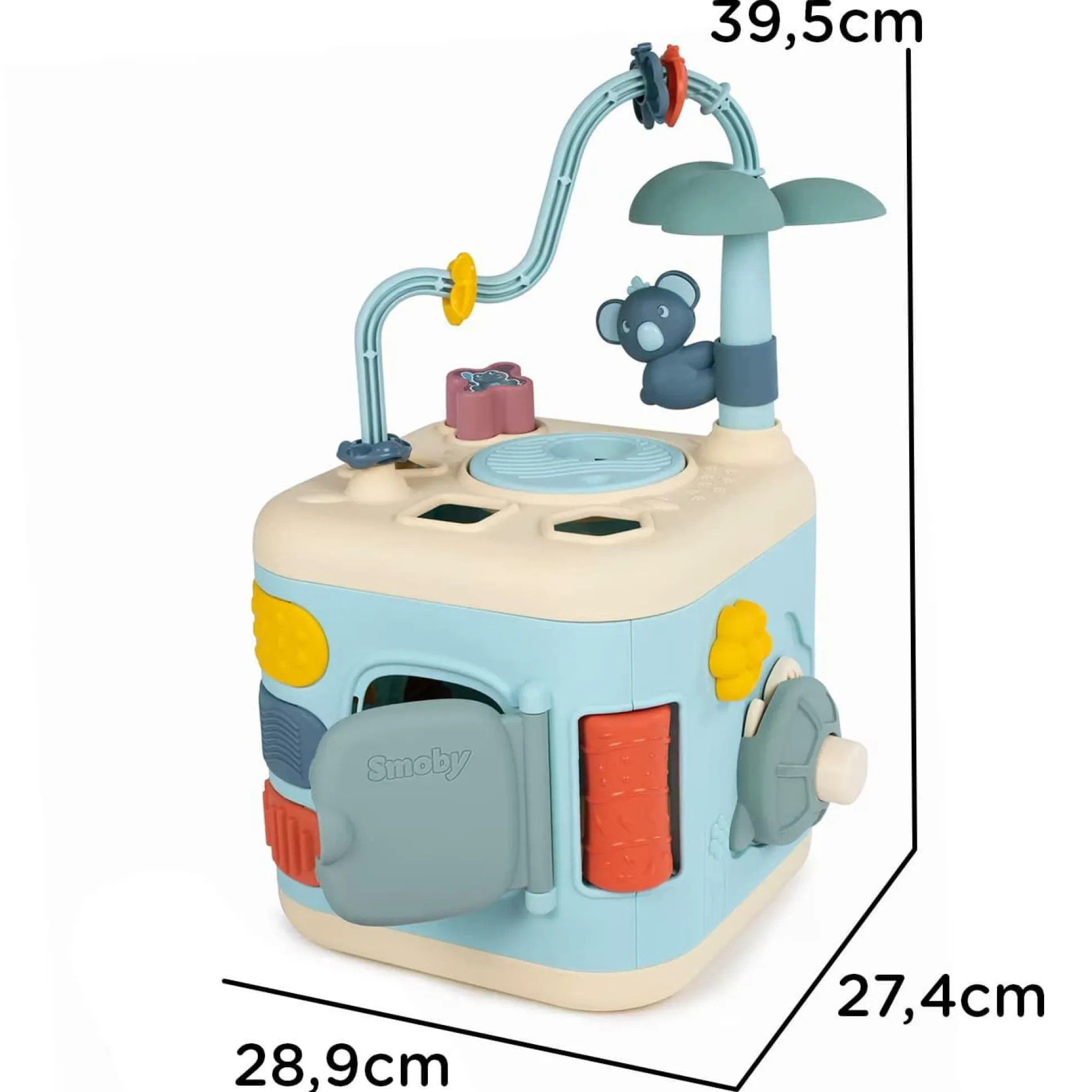 An dem Motorikwürfel gibt es viel zu entdecken, wie zum Beispiel ein wunderschönes Steckspiel zum Sortieren von Formen und eine Motorikschleife. Zahnräder, ein Schaufelrad, ein drehbarer Koala, eine Versteckspiel-Schildkröte und ein Marienkäfer mit „Krick-Krick“-Geräusch sowie verschiedene Oberflächen-Strukturen laden deinen kleinen Schatz zum Tasten und Greifen ein.