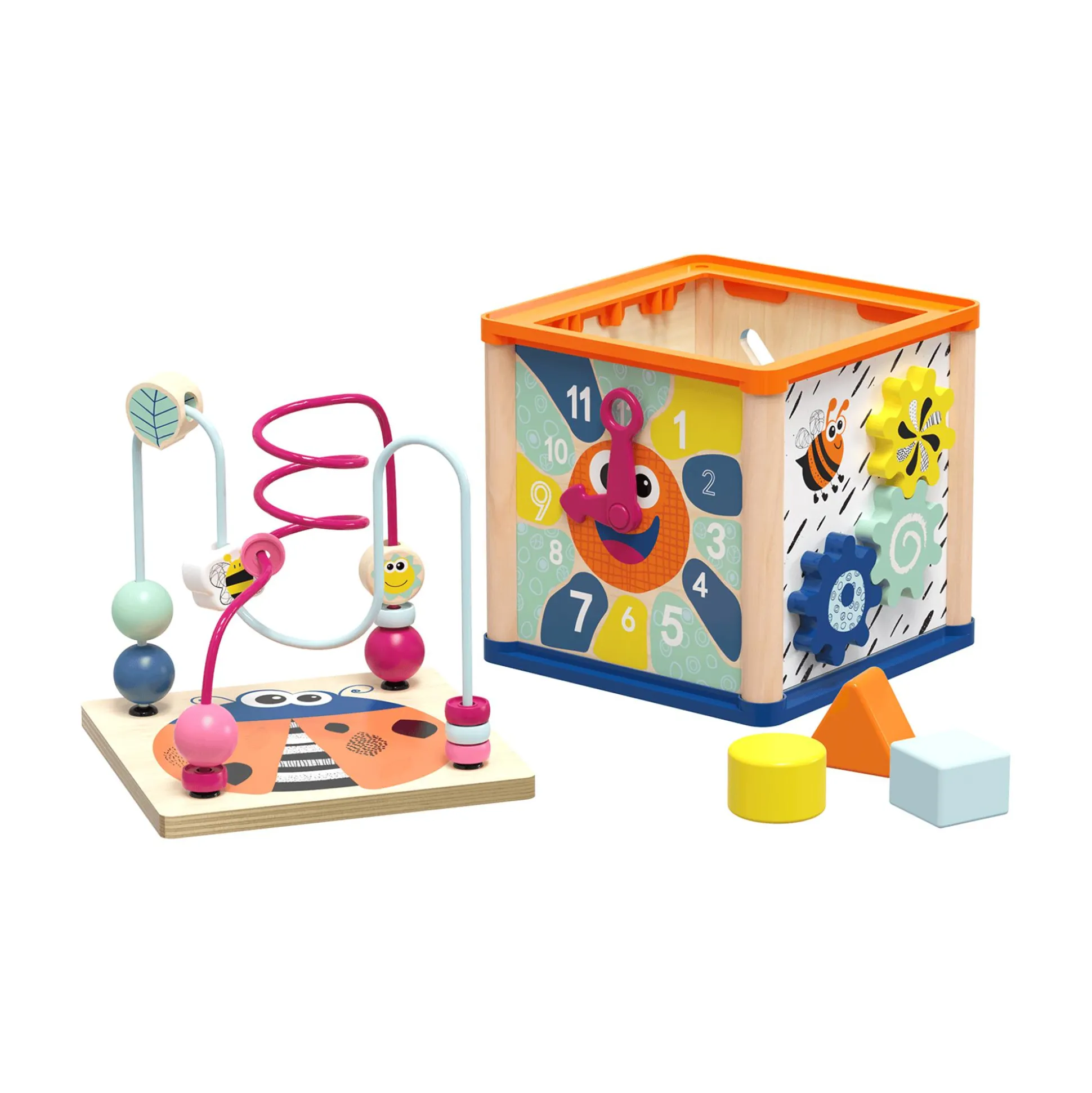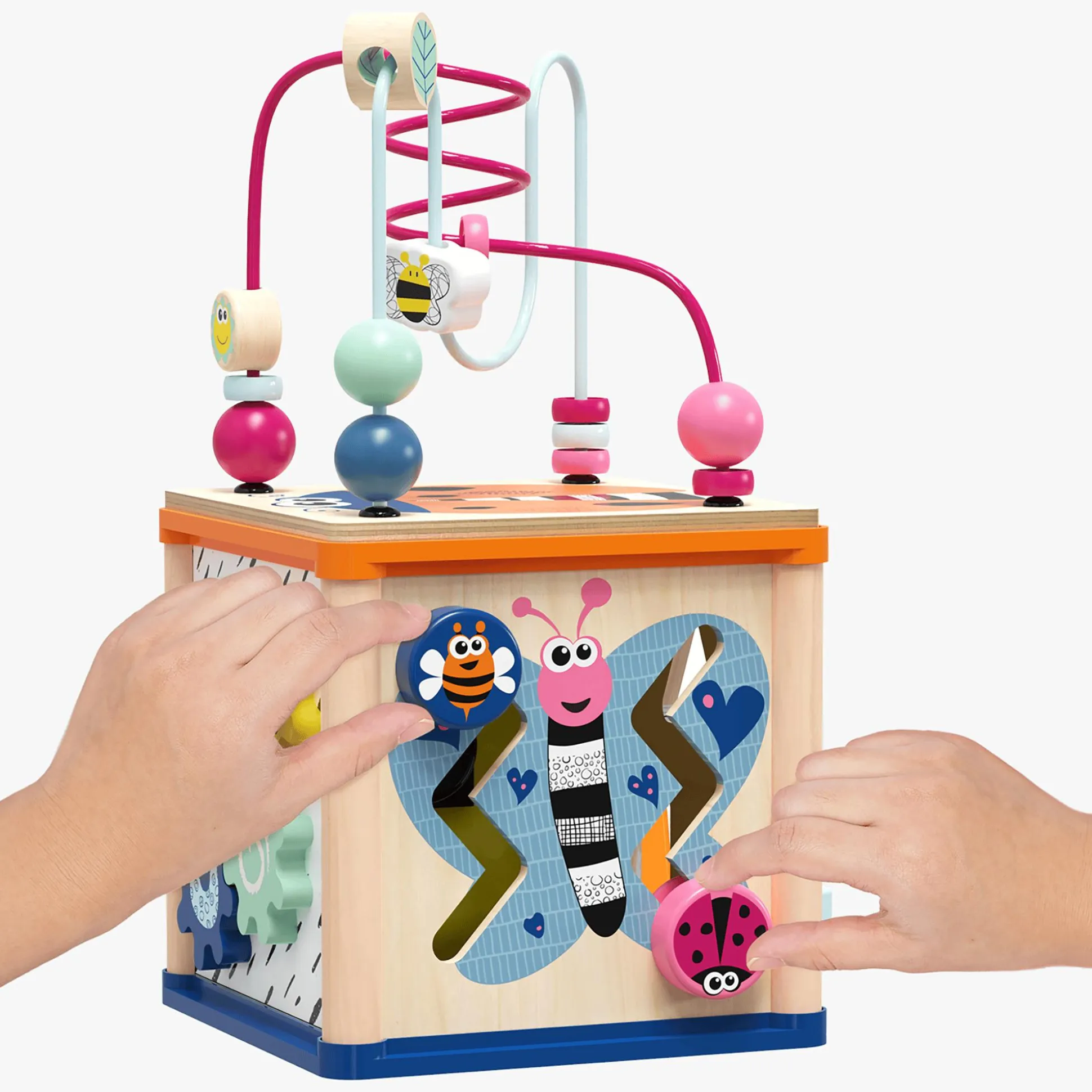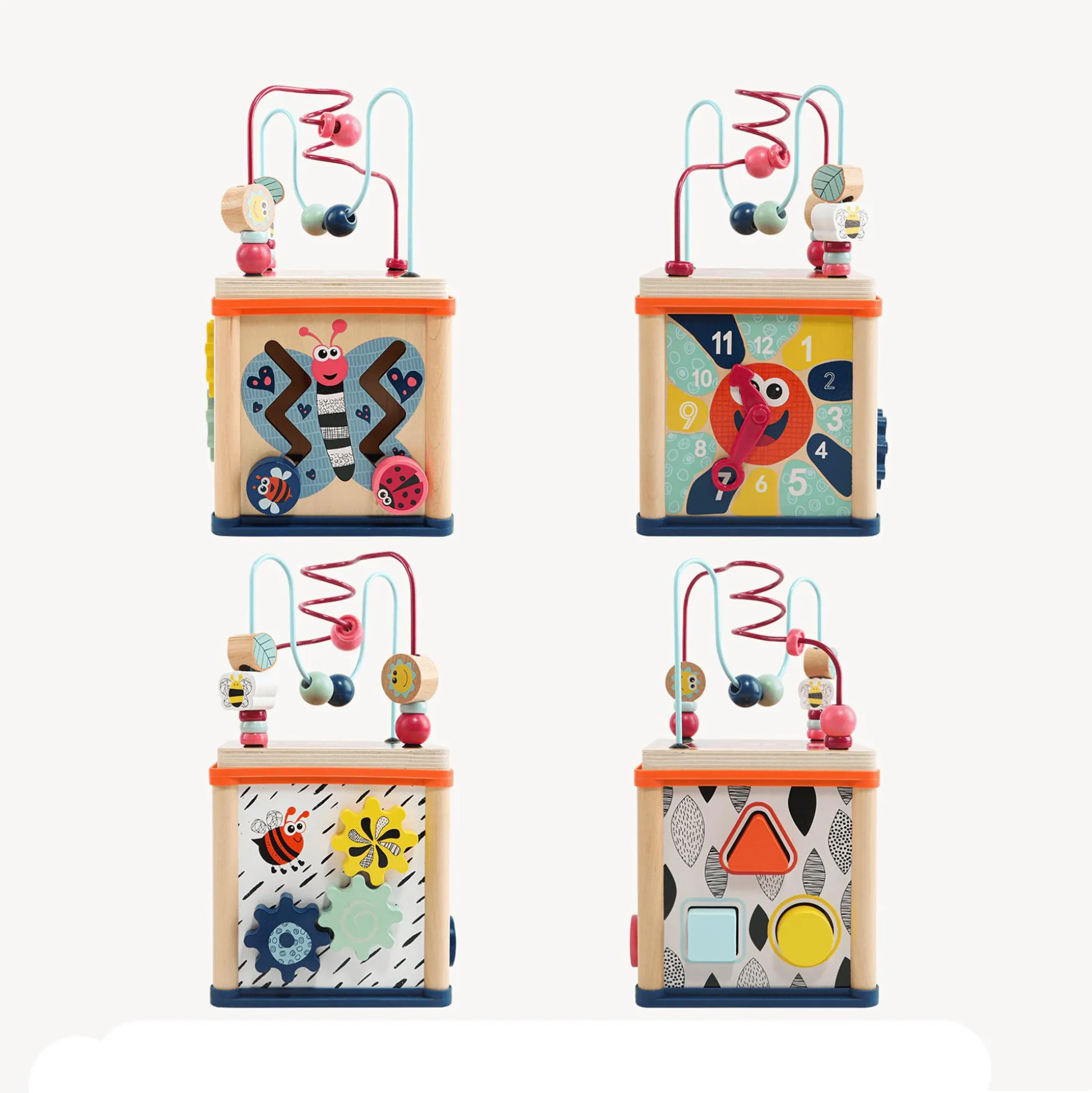 Der TOPBRIGHT Motorikwürfel bietet eine farbenfrohe Spielwiese voller Abenteuer für deinen kleinen Schatz. Das moderne Design in neutralen Farben zieht Kinder ab etwa einem Jahr magisch an. Kontrastreiche Schwarz-Weiß-Muster unterstützen außerdem die visuelle Entwicklung deines kleinen Entdeckers. Das vielseitige Spielcenter überrascht mit einem abnehmbaren Perlenlabyrinth, einem Steckspiel, einer Uhr mit beweglichen Zeigern und drehbaren Zahnrädern. Die Vielfalt an Formen, Farben und Bewegungen inspiriert zum freien Spiel und fördert dabei spielerisch die Hand-Augen-Koordination, Kreativität und die Fähigkeit, Farben und Formen zu erkennen.