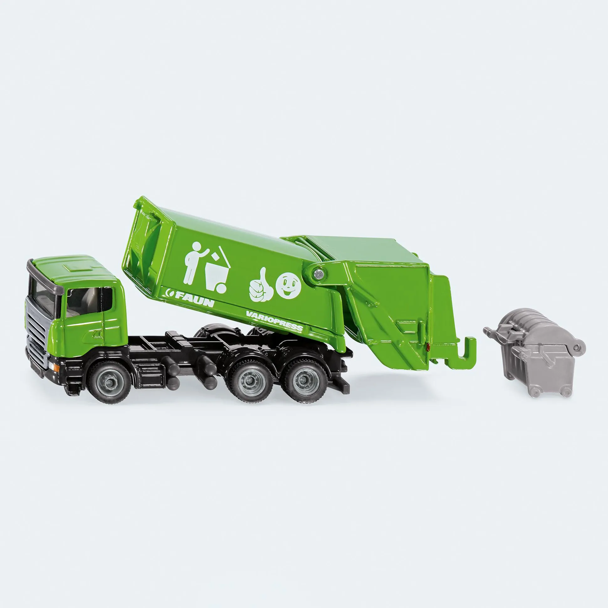 Entsorgungsfahrzeug der Marke Faun auf Basis eines Scania R-Fahrerhauses. 3-Achs-Fahrgestell mit einem Müllbehälter-Aufbau neuester Designentwicklung. Eine coole Bedruckung und die zu öffnende Ladevorrichtung am Heck runden das Bild dieses ansprechenden Modells im Maßstab 1:87 ab. Ein Großraummüllbehälter ist als Zubehör dem Modell beigefügt.