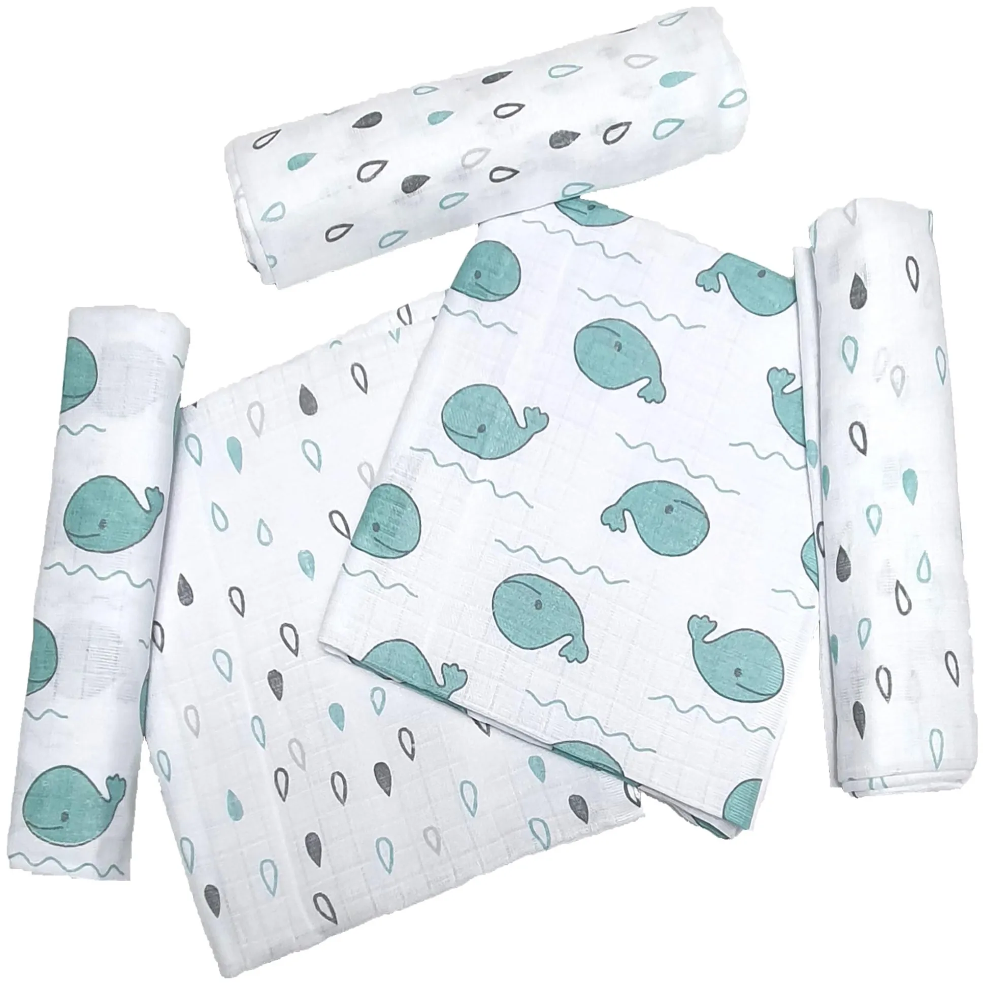 Die Mulltücher Whale & Drops von LITTLE ONE in den Maßen 80 x 80 cm bestehen aus 100% hochwertiger Baumwolle, sind absolute Alleskönner und universell einsetzbar. Sie sind besonders saugkräftig und können vielseitig verwendet werden, zum Beispiel als Spucktuch, Schmusetuch, Unterlage oder zum Einwickeln nach dem Baden. Das weiche, hautschonende Material macht die Mulltücher zum optimalen Begleiter – egal ob zu Hause oder unterwegs. Die Mulltücher von kommen im praktischen 5er Pack, wovon zwei mit niedlichen Wal-Motiven und drei mit coolem Tropfen-Motiven bedruckt sind.
