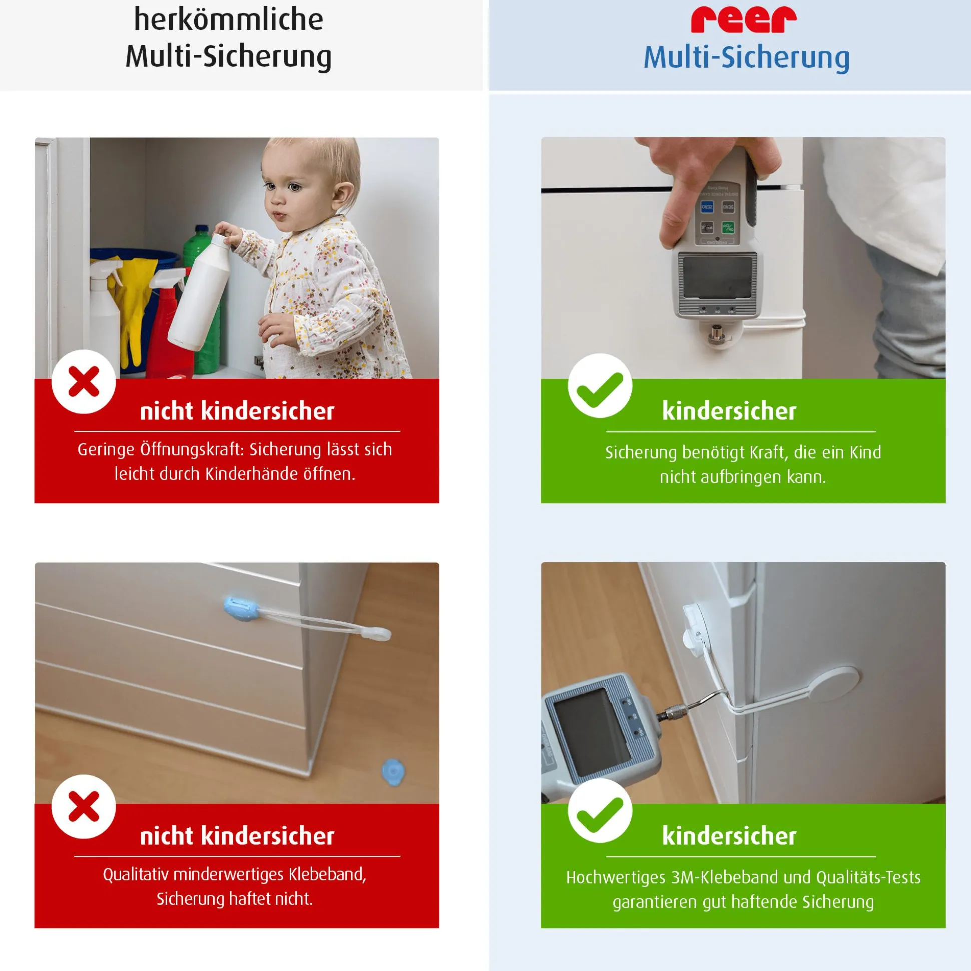 Die praktische Multi-Sicherung von reer hilft dir beim kindersicheren Verschließen von Schubladen, Schränken, Spülmaschinen, Kühlschränken und Mikrowellen. Trotz des starken Halts ist ein rückstandsfreies Entfernen möglich. Praktisch: Für Erwachsene ist die Sicherung mit nur einer Hand bedienbar.