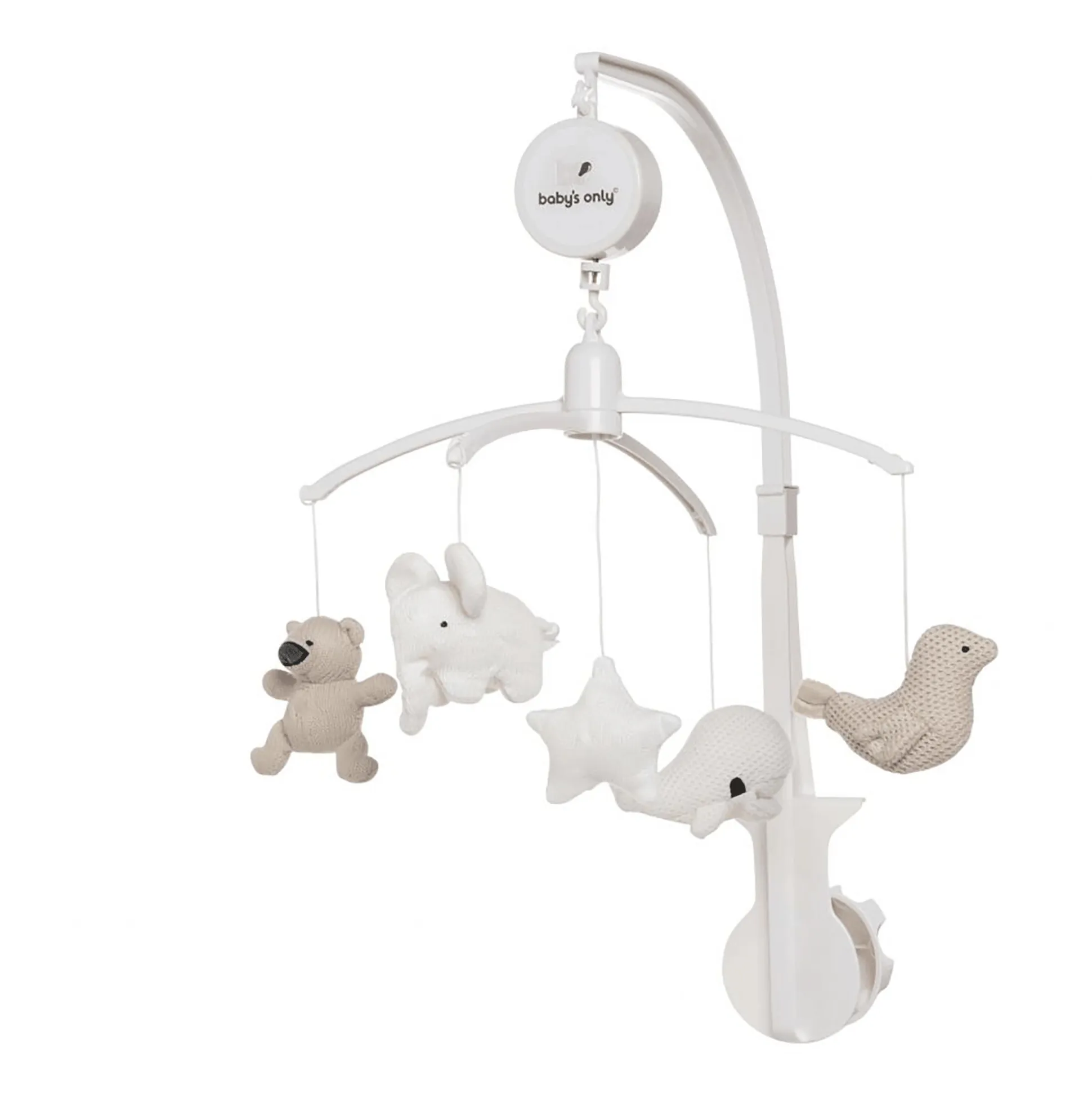 Das Musik-Mobile mit niedlichen Tieren von Baby’s Only ist ein bezauberndes und spielerisches Dekorationsstück für jedes Kinderzimmer. Das liebevoll gestaltete Mobile besteht aus hochwertigen Materialien und begeistert mit seiner neutralen Farbe in wollweiß. Es präsentiert eine Reihe gestrickter Tiere, die sorgfältig ausgearbeitet und mit lebendigen Details versehen sind. Außerdem spielt es das Lied „It’s a small world“, das deinen kleinen Schatz sanft ins Land der Träume begleitet. Dank seiner leichten Bewegungen erzeugt das Mobile eine beruhigende Atmosphäre im Raum und zieht die Aufmerksamkeit des Kindes auf sich. Es regt die Sinne an und fördert die visuelle Wahrnehmung sowie die Entwicklung der motorischen Fähigkeiten.