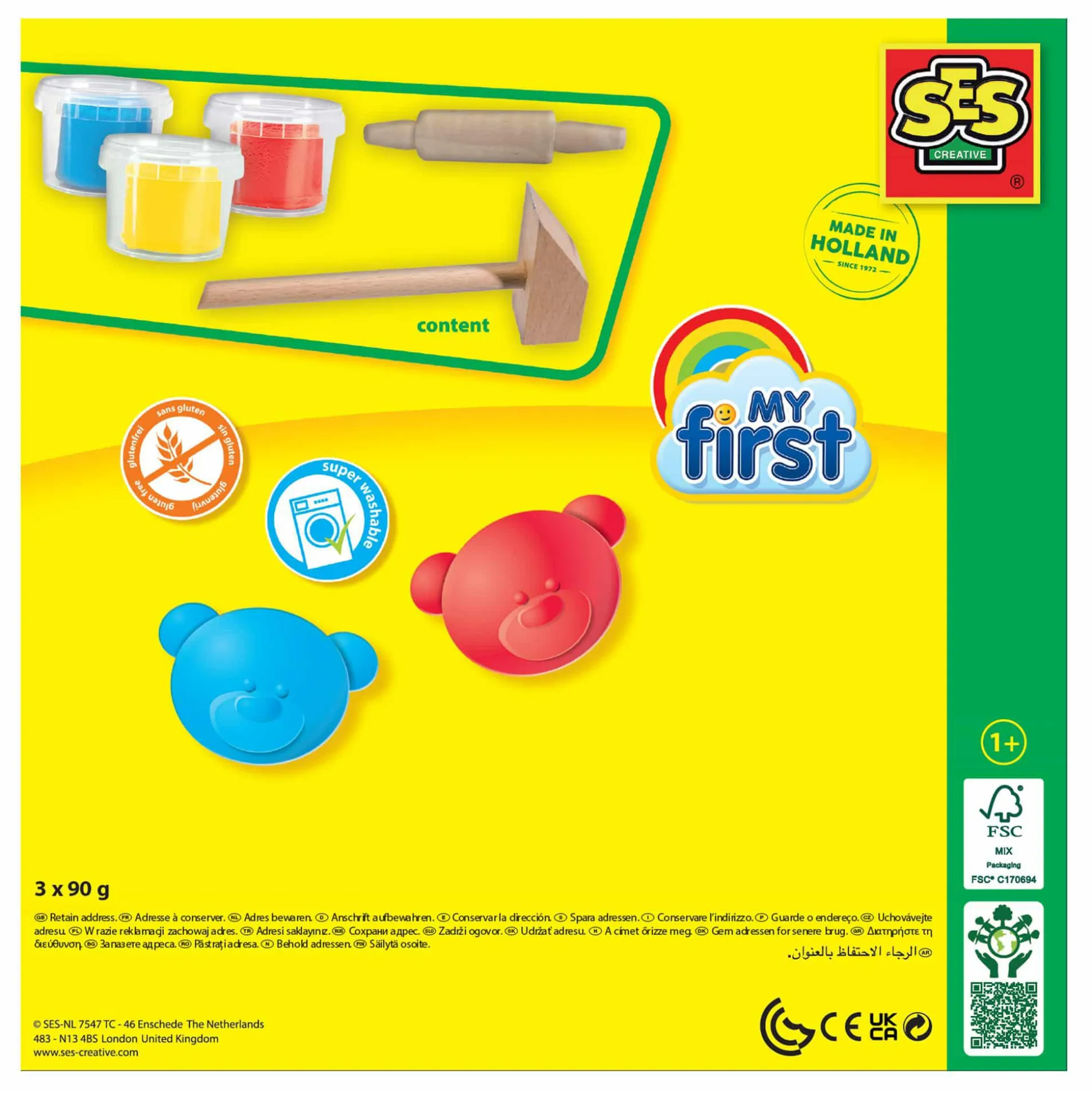 Mit den drei großzügigen Knetdosen in den leuchtenden Farben Rot, Gelb und Blau (jeweils ca. 90 g) kann dein Schatz nach Herzenslust modellieren, während der kleine Holzhammer und die Knetrolle aus Holz für echtes Werkstatt-Feeling im Kinderzimmer sorgen.