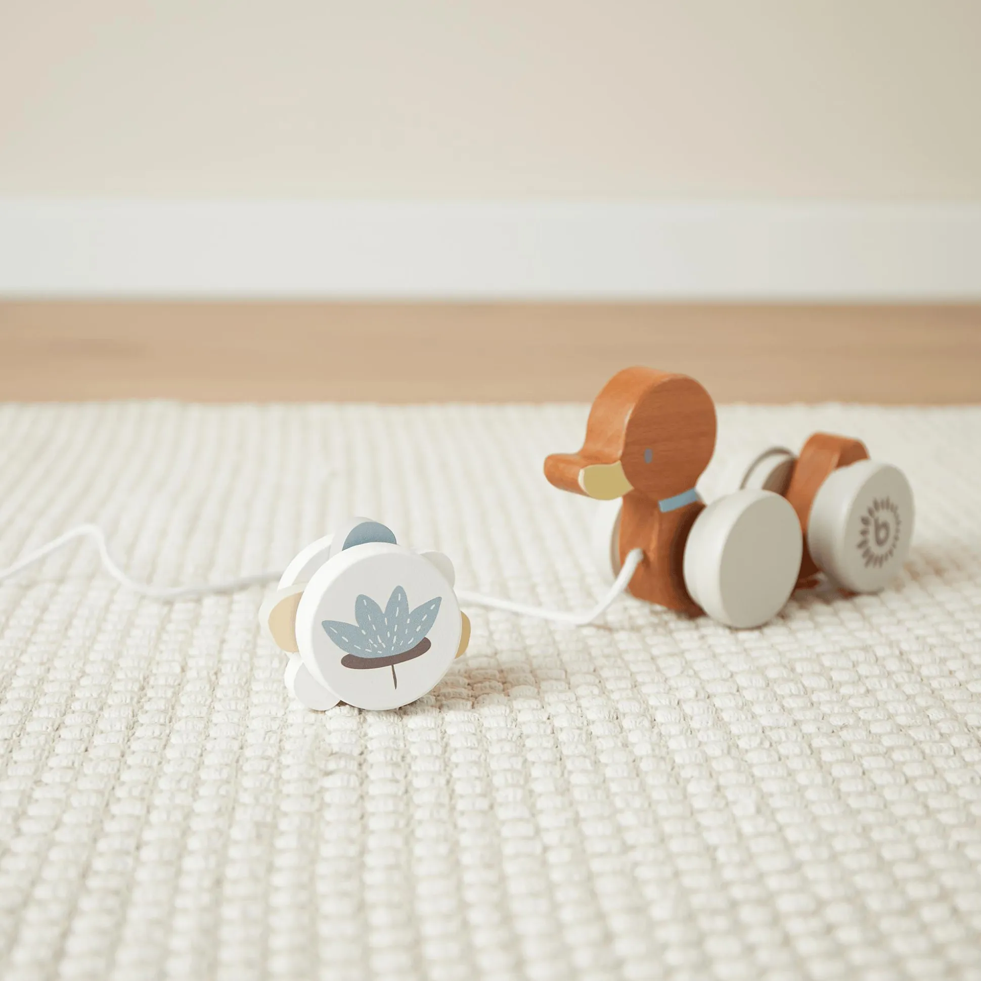 Mit der entzückenden Nachzieh-Ente von Bieco wird das Abenteuer des Laufenlernens für dein kleines Wunder zu einem echten Vergnügen! Dein kleiner Schatz kann die lange Schnur beim ersten Gehversuch fest in der Hand halten und schon rollt die Ente auf ihren vier hölzernen Rädern hinterher. Das kleine Zahnrad auf dem Rücken der Ente dreht sich mit und erzeugt dabei fröhliche Geräusche, die die Aufmerksamkeit deines Nachwuchses wecken. Außerdem kann es abgenommen und erforscht werden.
