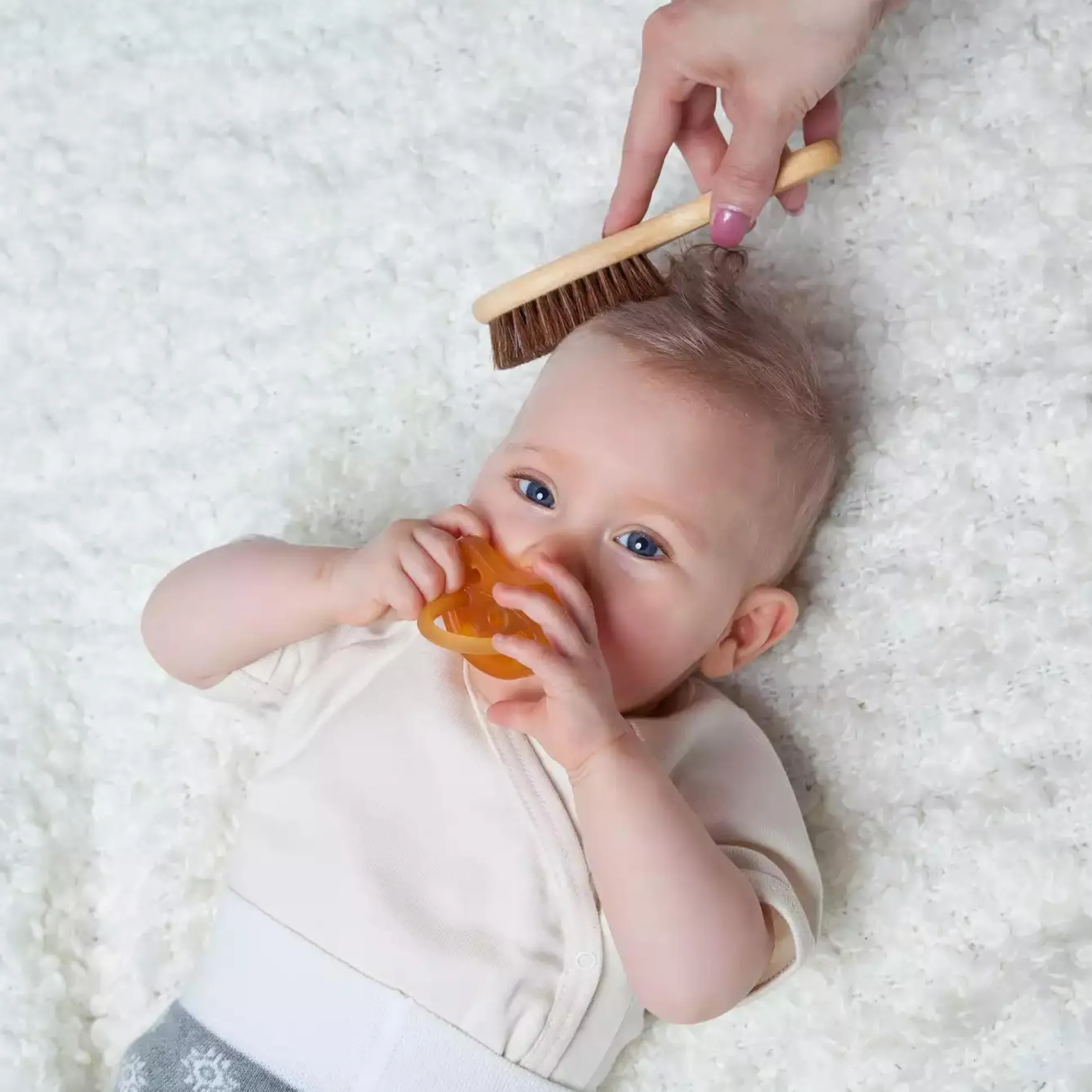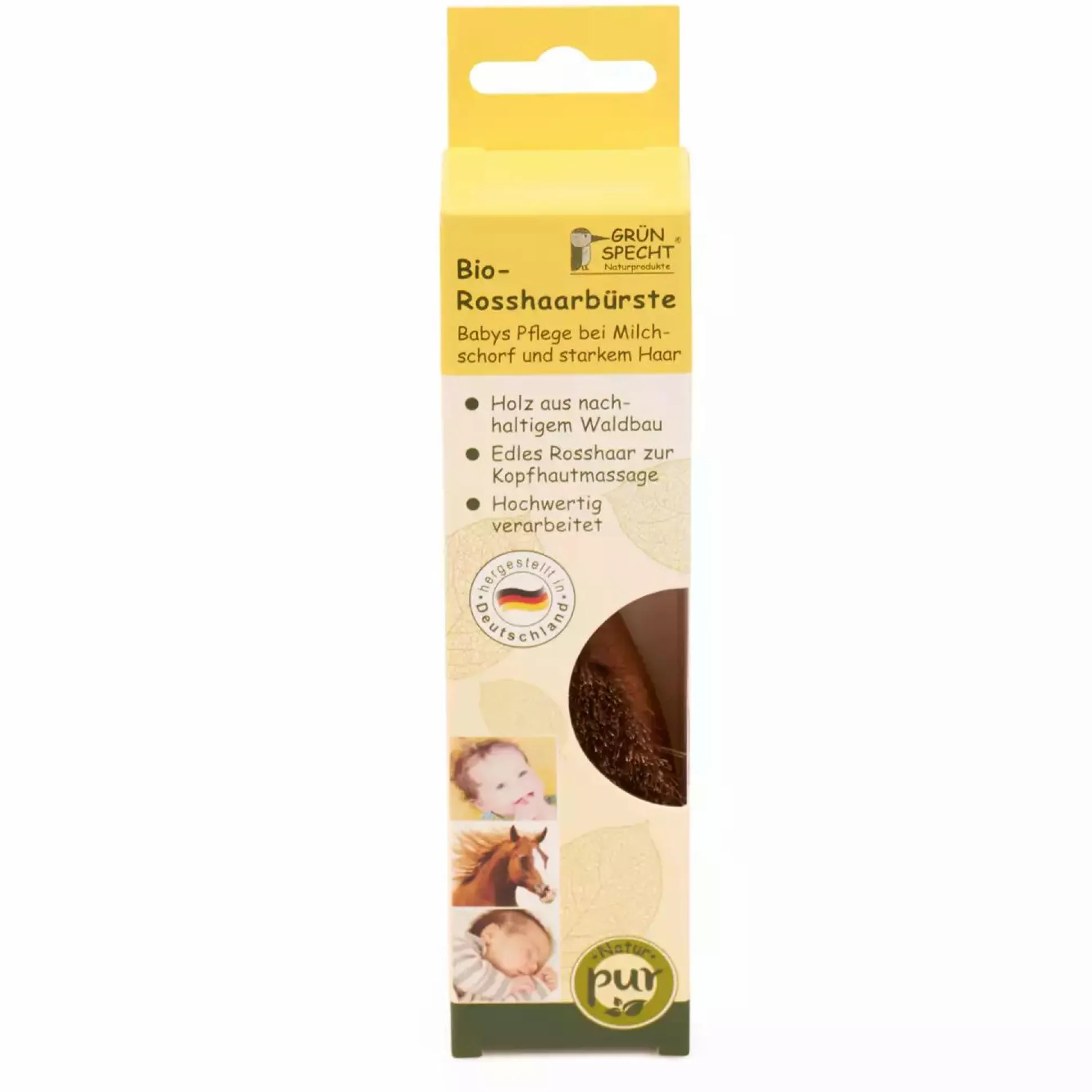 Die etwas festere Bürste aus edlem Rosshaar eignet sich für Babys mit dichtem Haar. Volles Haar und eigensinnige Locken können mit der natürlichen Rosshaarbürste von Grünspecht gut gebändigt werden. Auch zur Entfernung von Kopfbelag und abgelöstem Milchschorf empfiehlt sich ihre Verwendung.
