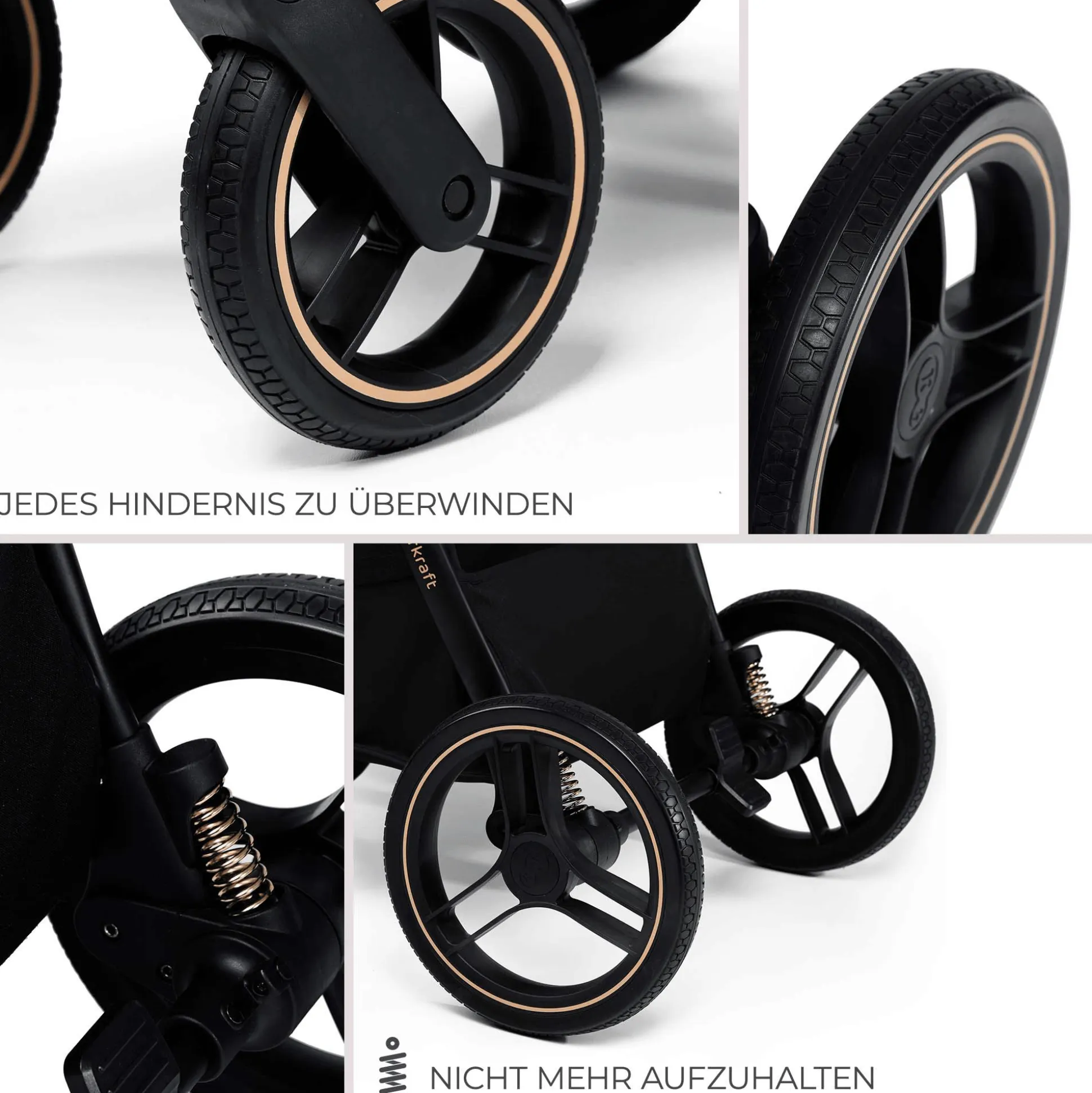 Die großen, wartungsfreien Reifen aus langlebigem Gummi garantieren eine sanfte Fahrt, egal ob auf Kopfsteinpflaster oder Waldwegen. Die 4-Rad-Federung sorgt für eine optimale Dämpfung und gleicht Unebenheiten mühelos aus. Dabei lassen sich die Vorderräder für schwierige Untergründe blockieren, sodass du immer volle Kontrolle hast.