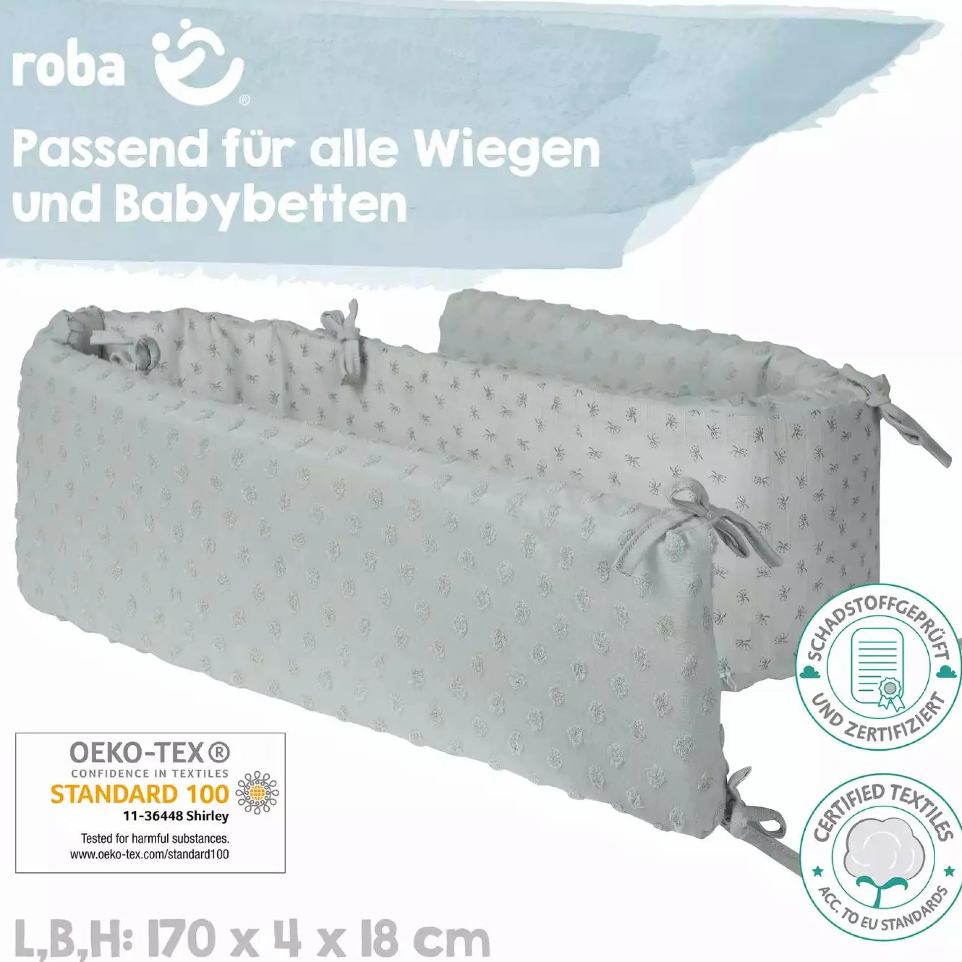 Das weiche Nestchen im Design „Frosty Green“ von Roba aus der „Lil Planet“ Kollektion sorgt dafür, dass dein Baby sich nicht an den harten Gitterstäben stoßen kann. Zusätzlich schützt es vor Zugluft und sorgt für eine Schlafumgebung, in der sich dein Baby geborgen fühlt. Das Nestchen ist durch Bindebänder variabel zu befestigen.