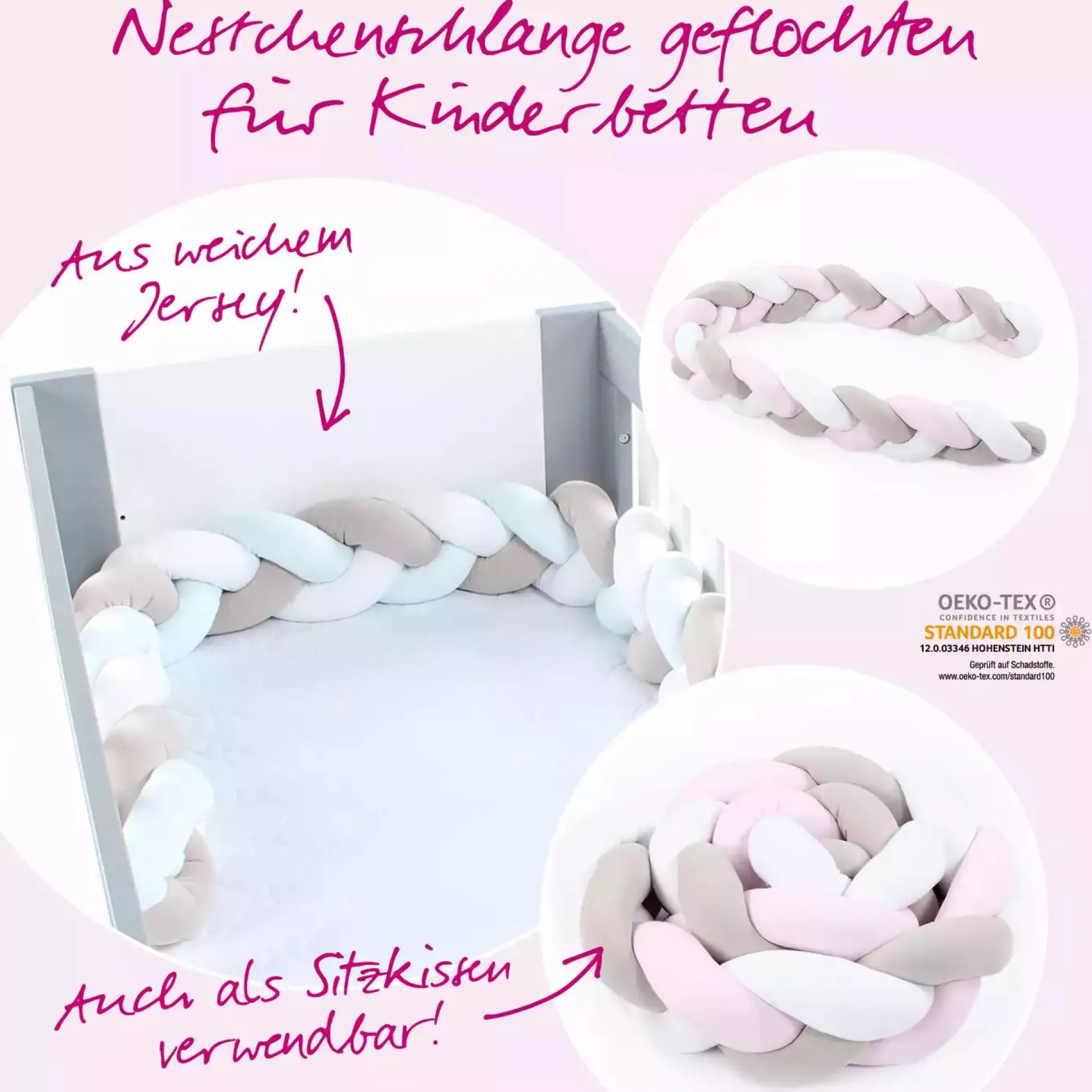 Ein ausgewogener Schlaf ist für Kinder sehr wichtig. Die geflochtene Nestchenschlange von Tobi schützt zuverlässig den Kopf deines Babys vor harten Gitterstäben, kalten Wänden, Lärm und schafft eine angenehme und ruhige Schlaf-Atmosphäre. Aus weichem gekämmten Jersey, händisch gefertigt und mit antiallergischer Silikonwolle gefüllt, hat die Tobi Nestchenschlange eine ausgezeichnete Qualität, ist formstabil und sorgt für Sicherheit und Komfort deines Kindes. Darüber hinaus ist die Nestchenschlage vielseitig verwendbar – im Laufstall, als Spielgefährte oder Zugluftstopper. Zusammengerollt und mit den Bändchen fixiert ist sie auch als Sitzkissen bestens geeignet. Die Jersey-Nestchenschlange geflochten ist außerdem bis 40°C waschbar.