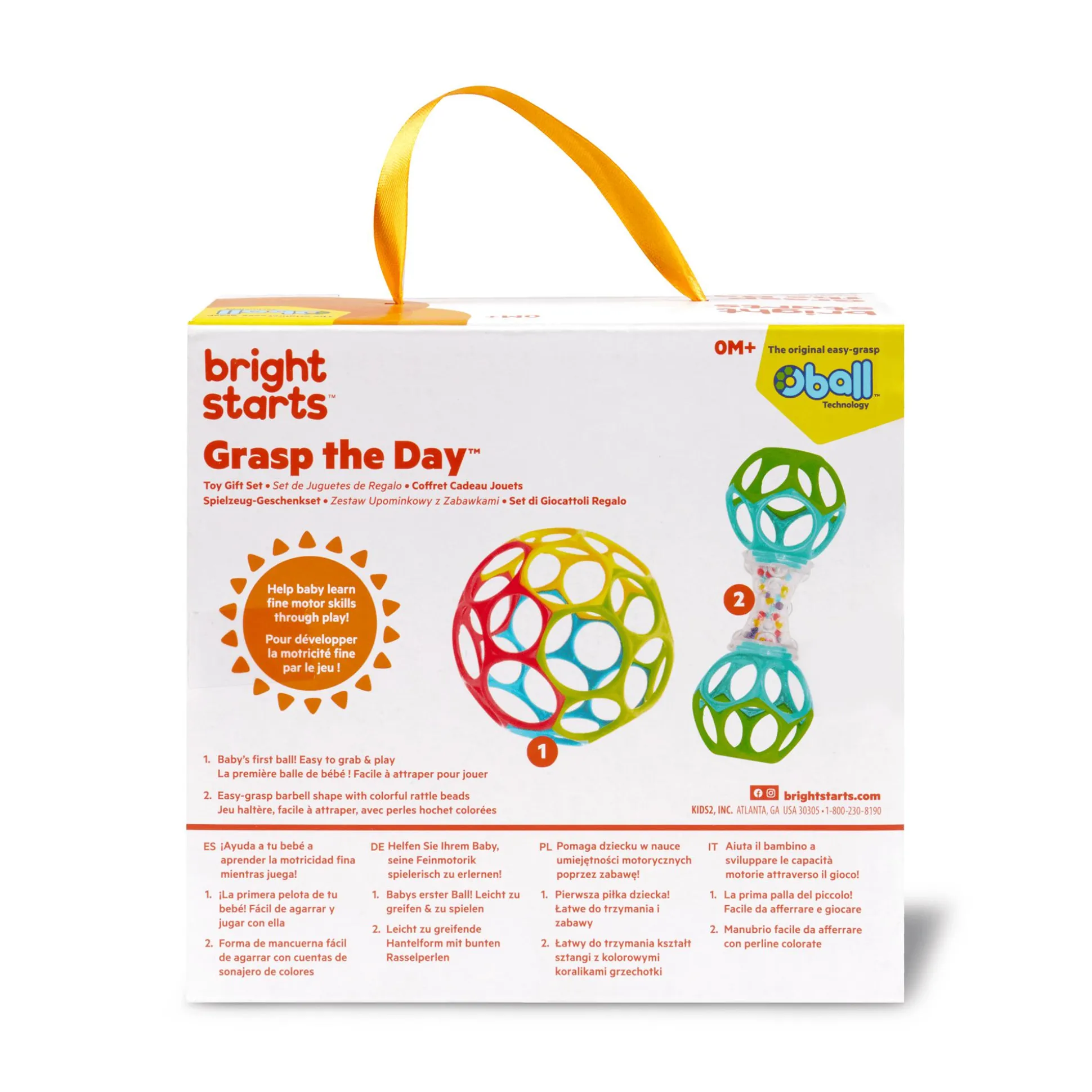 Das Geschenkset „Grasp the Day“ von Bright Starts enthält zwei der beliebtesten Oball-Spielzeuge, die deinem Kind bereits ab der Geburt Freude bereiten. Die Spielzeuge sind mit ihren leicht greifbaren Details und Grifflöchern perfekt für kleine Hände und fördern die Feinmotorik spielerisch. Der Oball Shaker beeindruckt mit einem durchsichtigen, strukturierten Griff und bunten Perlen, die faszinierende Geräusche machen, die flexiblen Enden bestehen aus dem bewährten Oball-Material. Der Oball Classic begeistert mit 32 großen Grifflöchern und einem weichen, stabilen Design, ideal zum Greifen, Schütteln und Rollen.