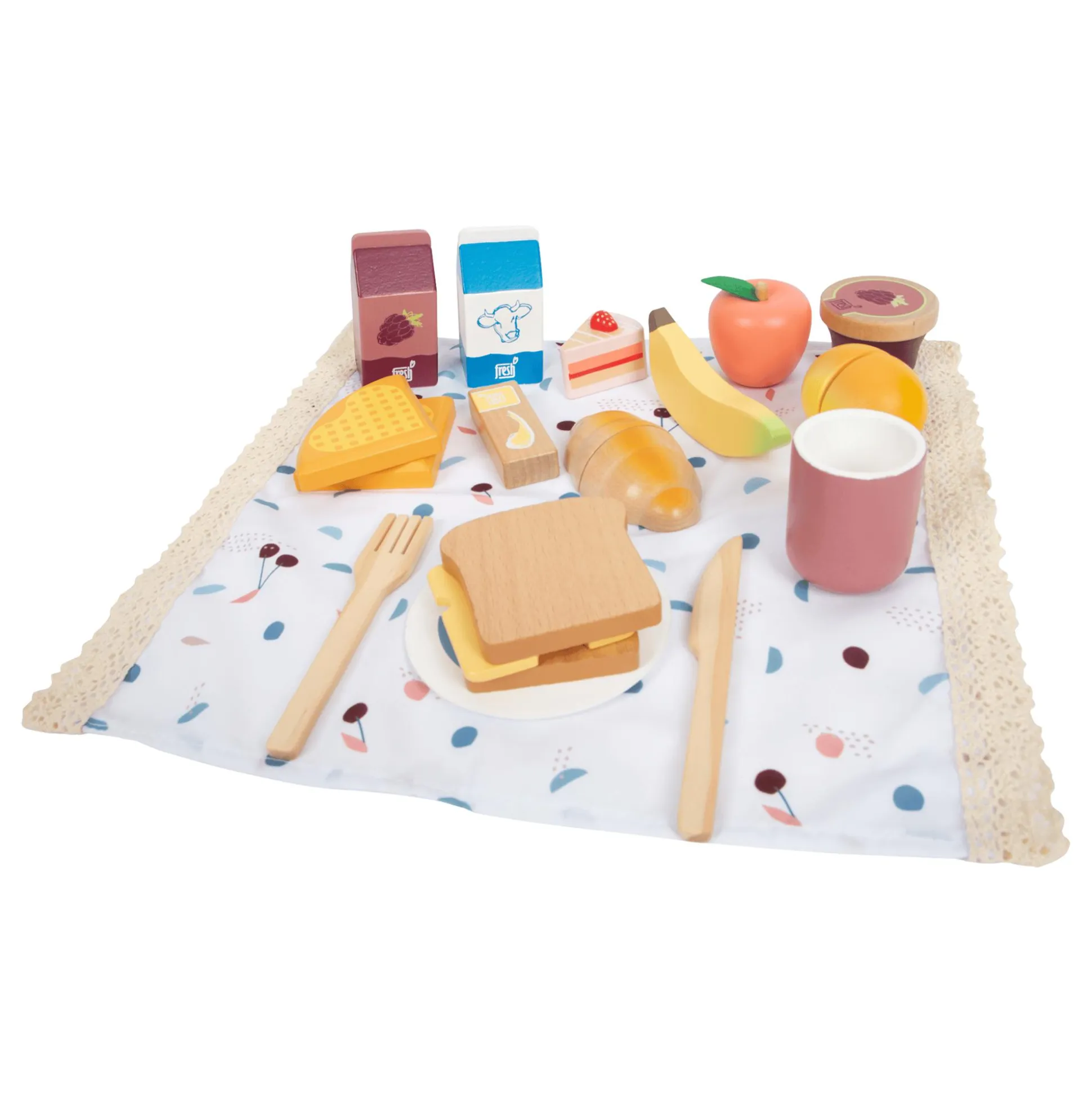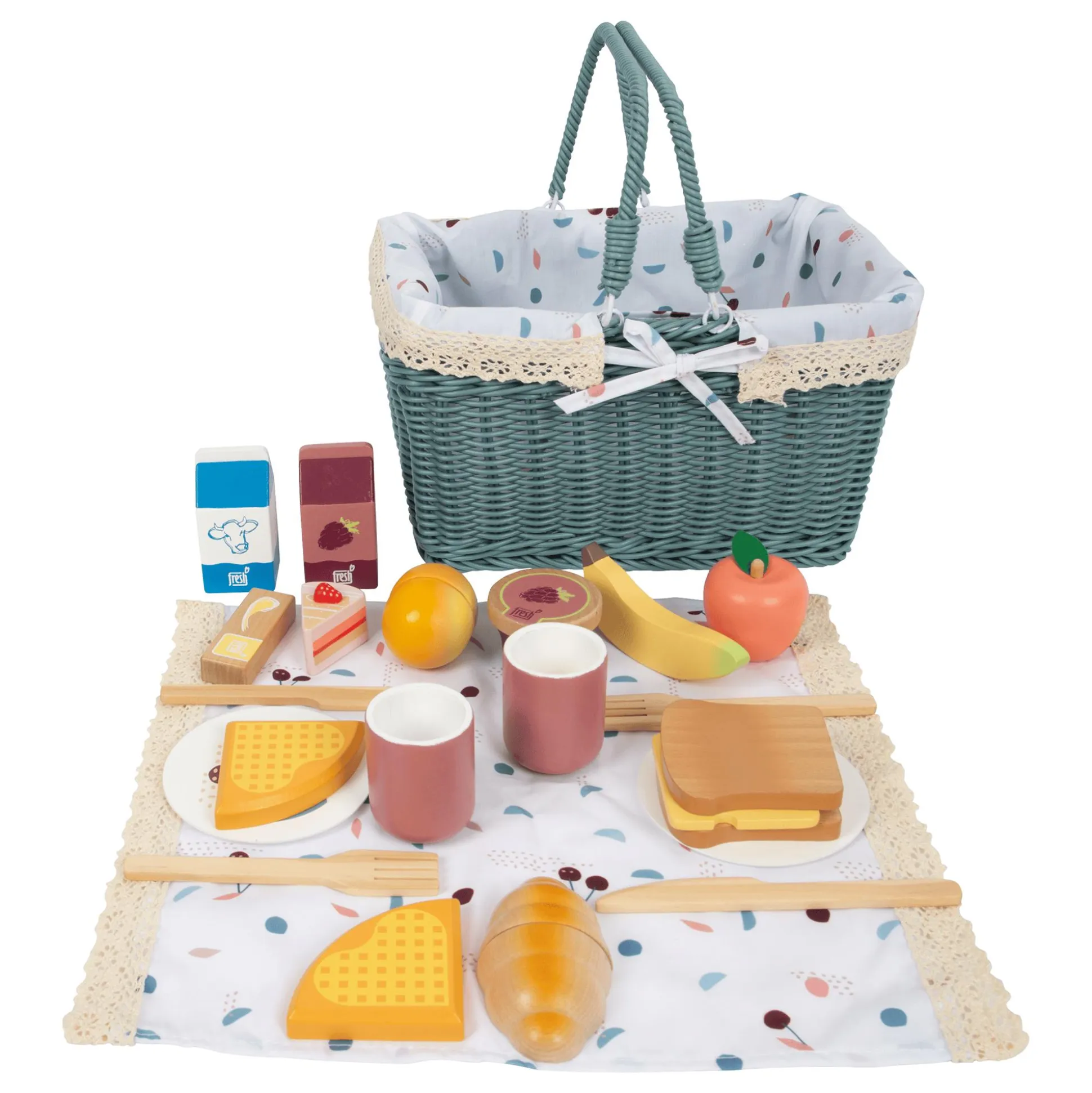 - 1 Picknickkorb, 1 Picknickdecke, 1 Orange, 1 Croissant, 2 Teller, 2 Messer, 2 Gabeln, 2 Becher, 1 Apfel, 1 Stück Kuchen, 1 Banane, 2 Scheiben Brot, 1 Scheibe Käse, 1 Stück Butter, 1 Packung Saft, 1 Packung Milch, 1 Becher Marmelade, 2 Waffeln