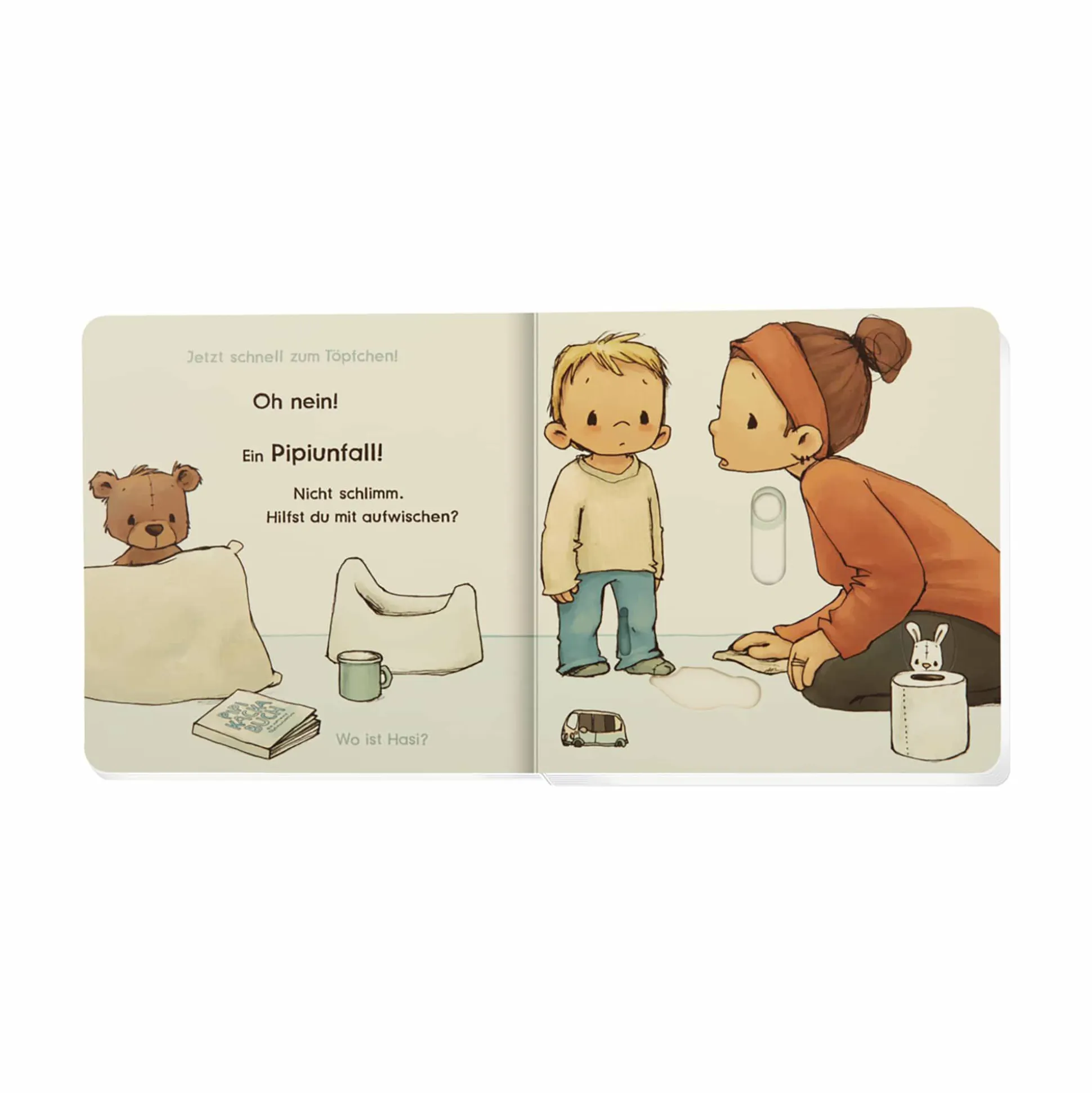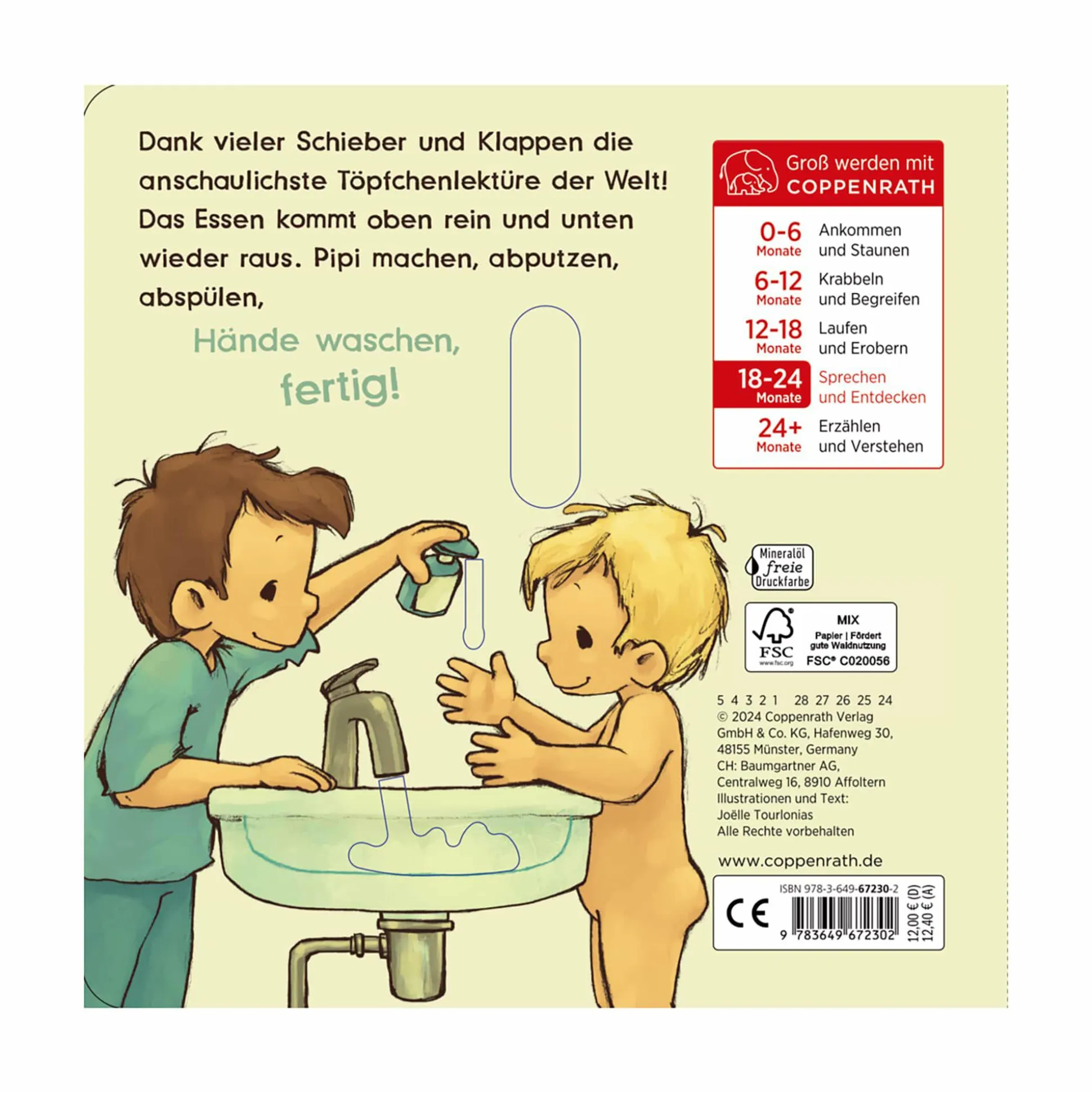 Das Essen kommt oben rein und unten wieder raus. Dank vieler Schieber und Klappen ist dieses besondere Pappbilderbuch die anschaulichste Töpfchenlektüre der Welt! Pipi machen, abputzen, abspülen, Hände waschen, fertig! Und wer findet Hasi auf jeder Seite? Ein Bilderbuchvergnügen zum Immer-wieder-Anschauen und Mitspielen!
