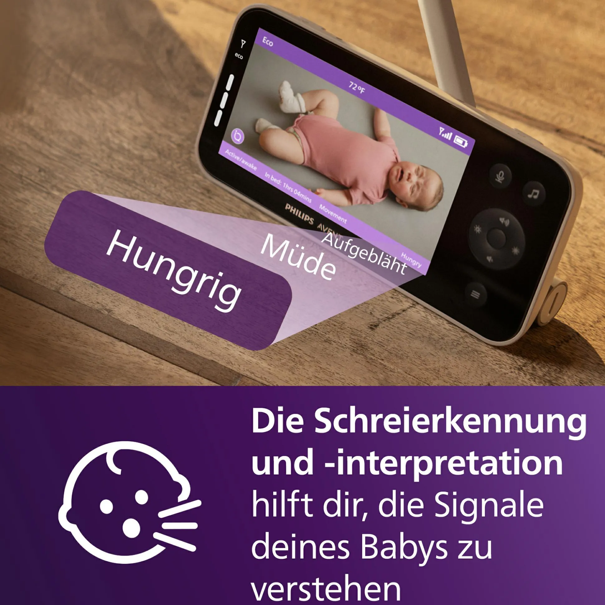 - integrierte Schrei-Interpretationshilfe, um dir Hinweise zu geben, ob dein Baby müde, hungrig oder einfach unzufrieden ist