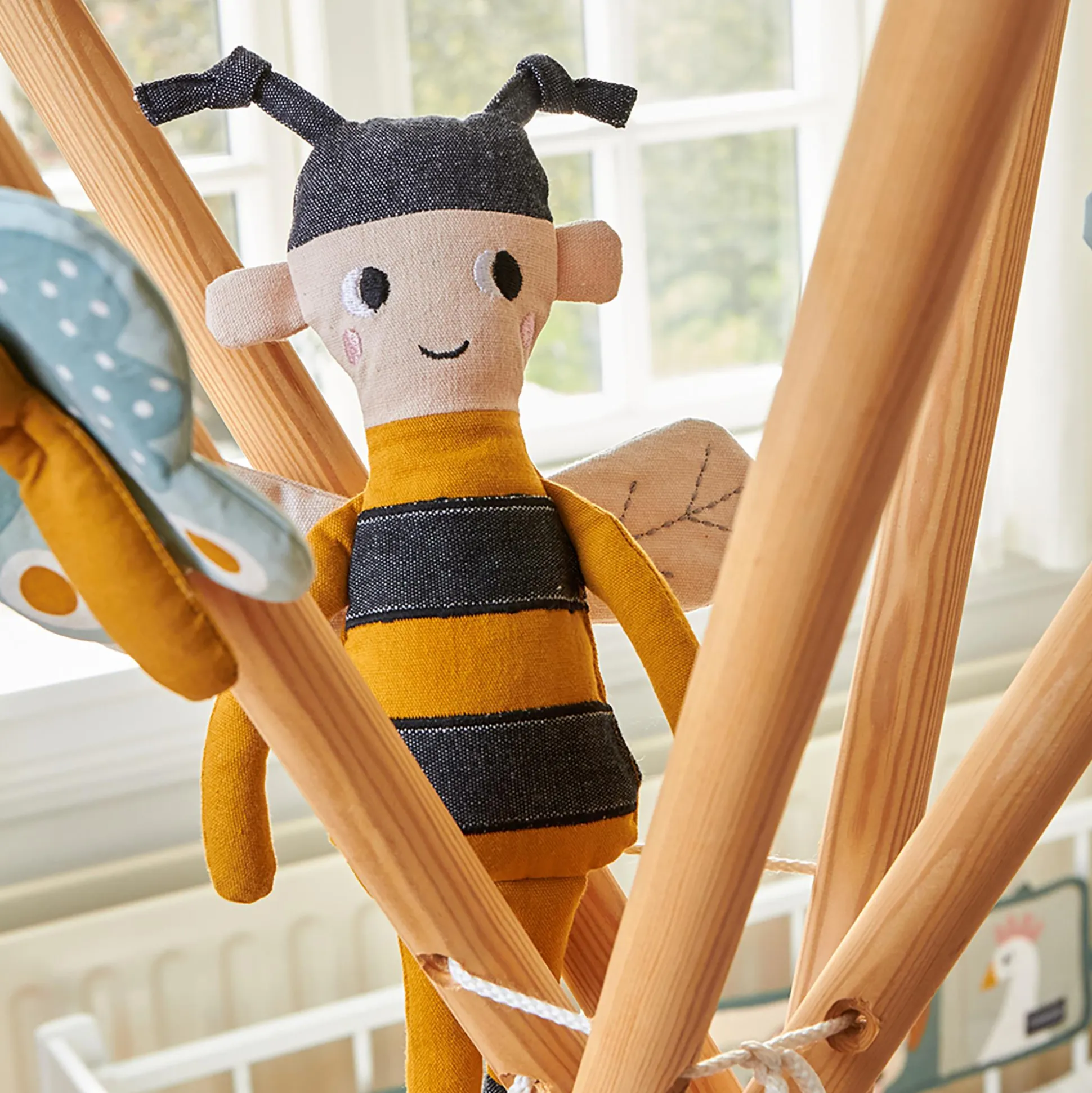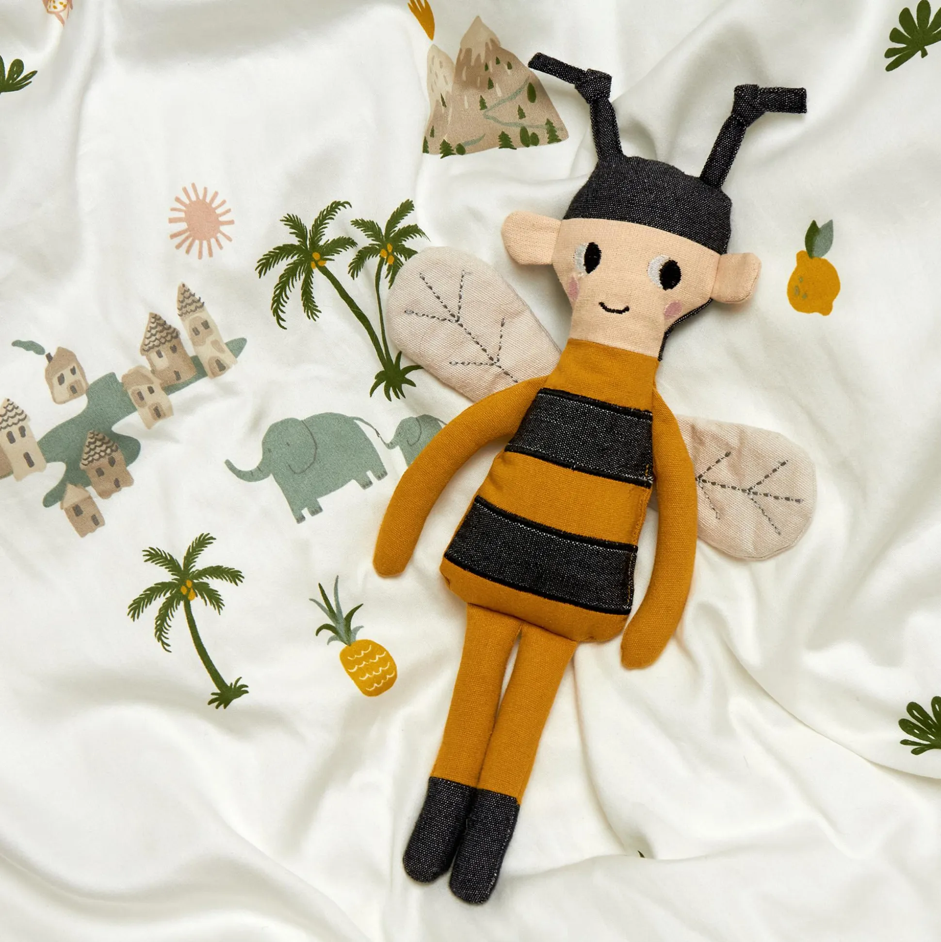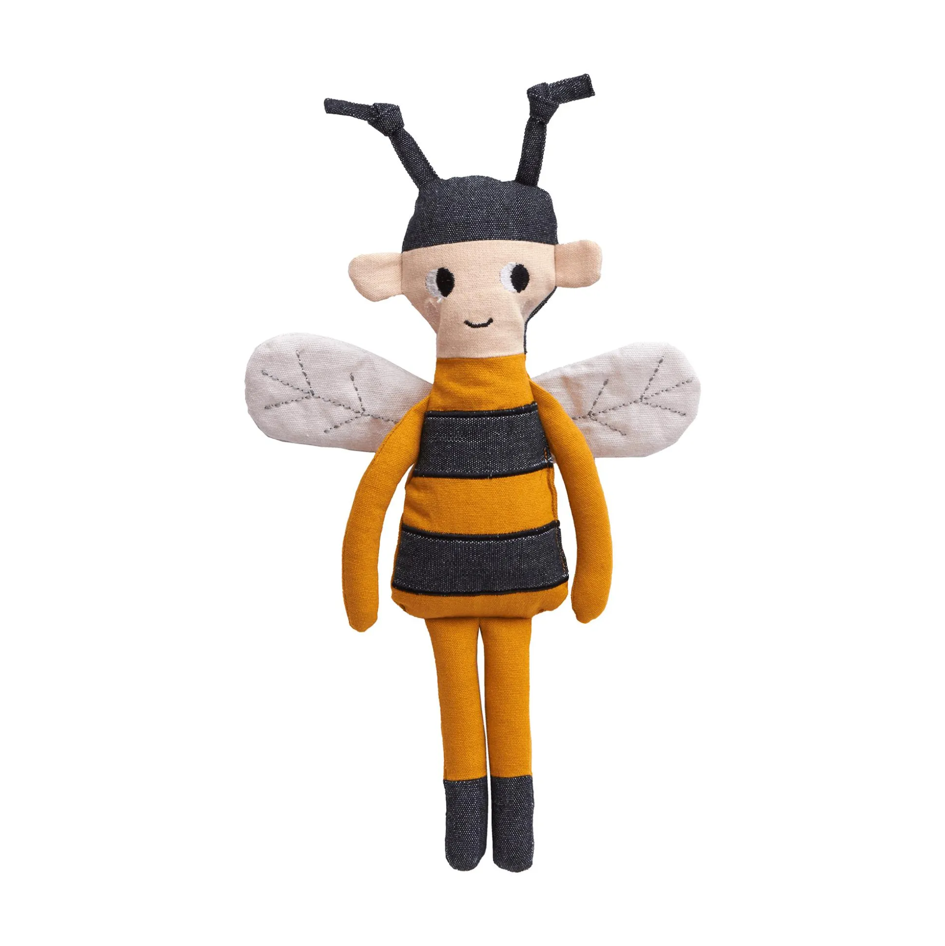 Die Puppe Biene von Roommate ist eine kuschelweiche Stoffpuppe, die deinen kleinen Nachwuchs mit ihrem freundlichen Gesicht und liebevollen Design begeistert. Ihr gestreiftes Outfit in warmen Honigtönen mit dunklen Kontrasten schafft einen charakteristischen Bienen-Look, während die weichen, bestickten Flügel und die niedlichen Fühler auf ihrem Kopf ihr einen verspielten Charme verleihen.
