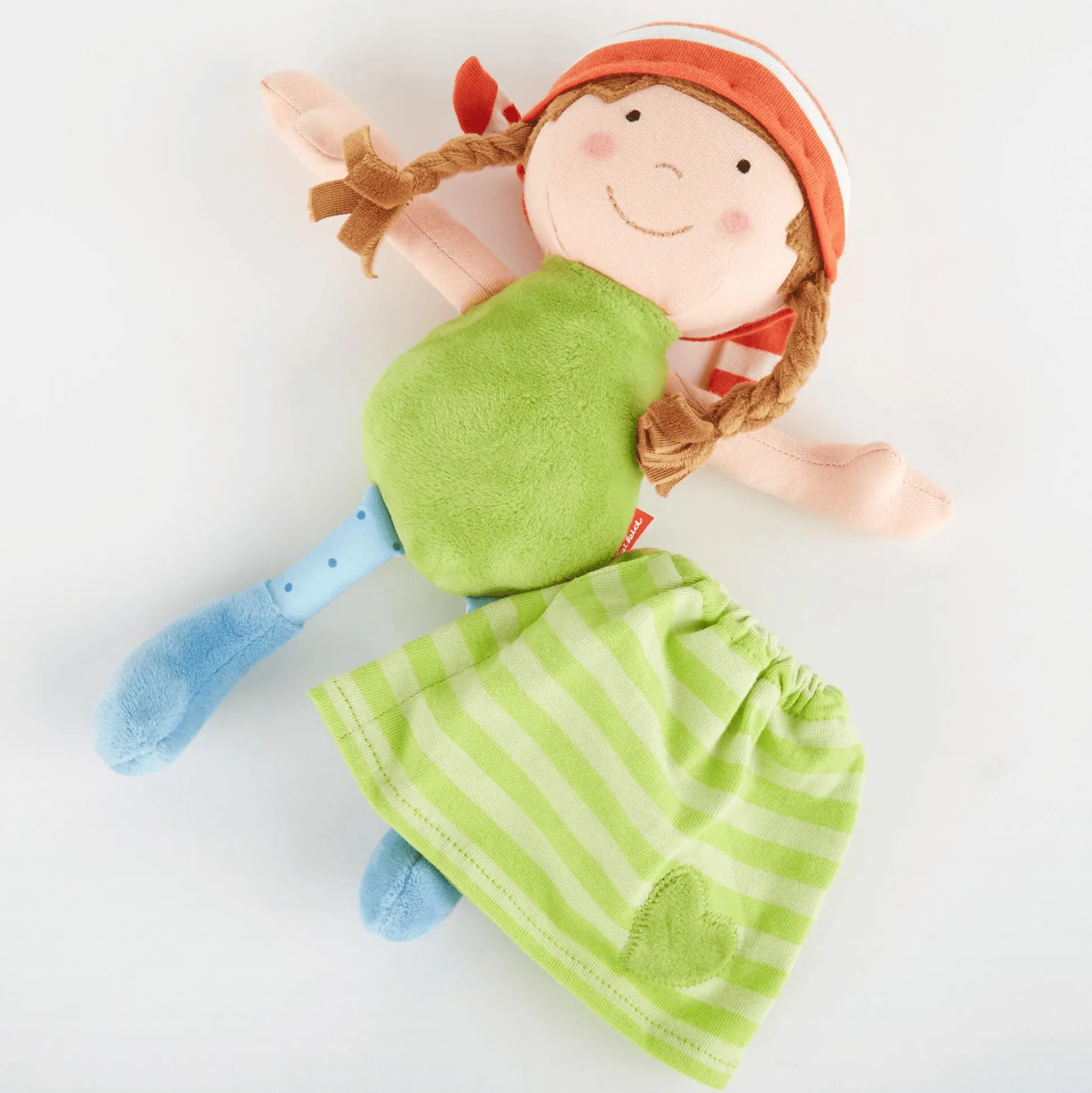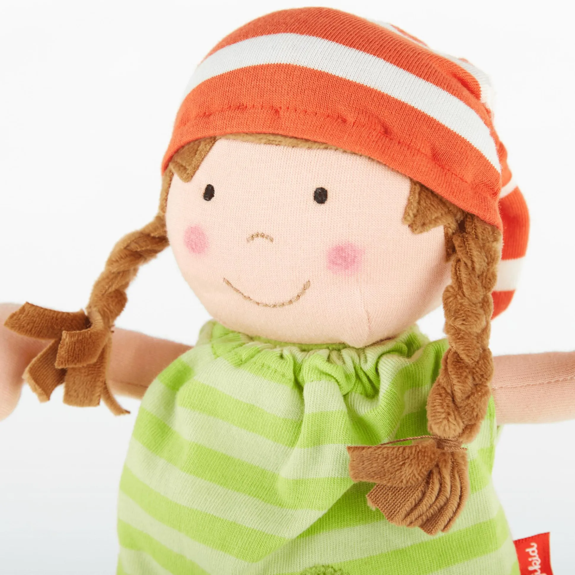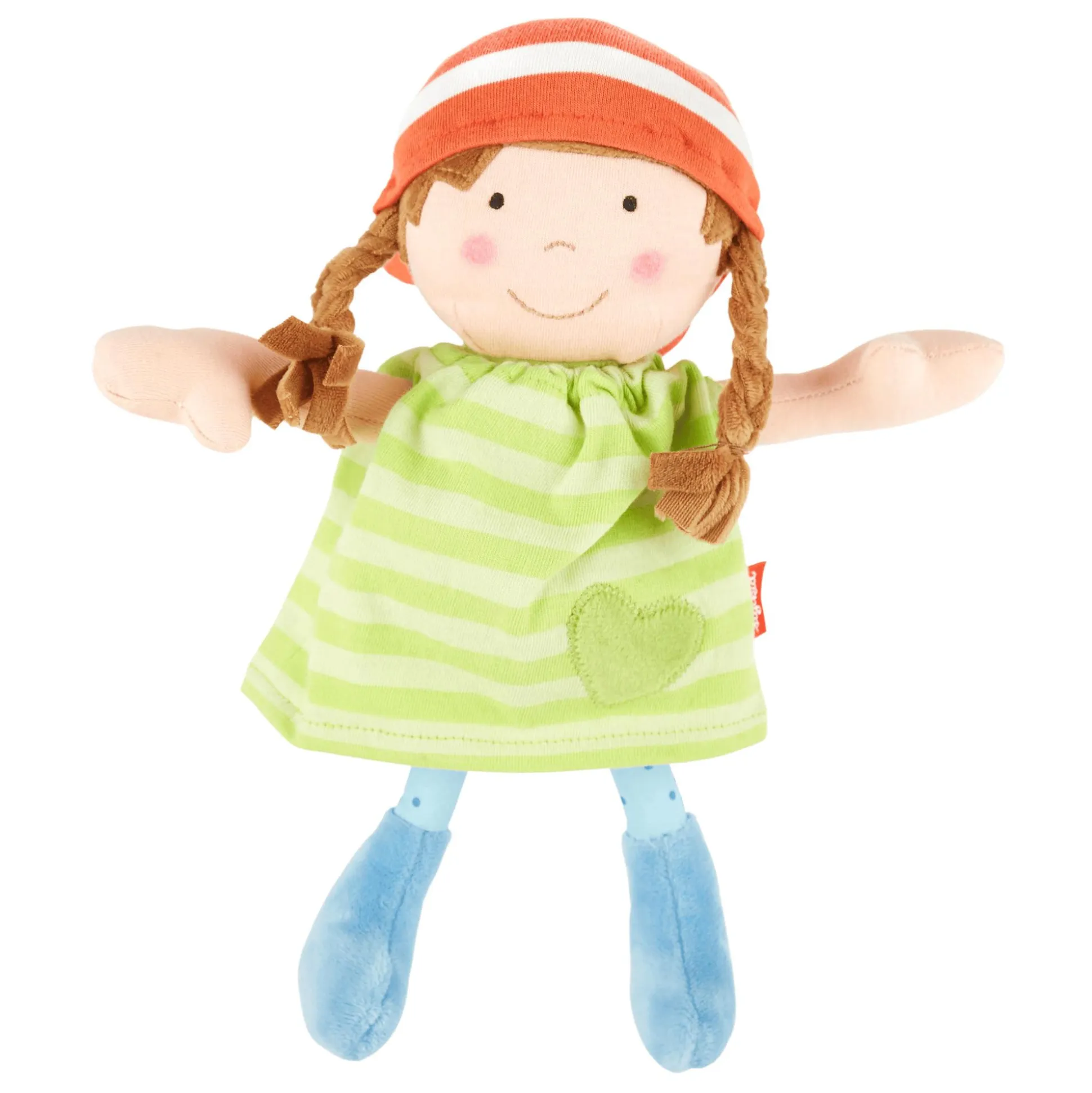 Zum täglichen Knuddeln wie gemacht sind diese niedlichen Stoffpuppen für Babys und Kleinkinder: Unter dem ausziehbaren Kleidchen kommt ein Körper aus softem Plüsch, strumpfbunte Beine aus Stoff und angedeutete Veloursstiefelchen zum Vorschein. Ebenfalls fest vernäht ist die lustige Zipfelmütze, damit sie beim Schmusen nicht verlorengeht. Auch die Zöpfe sind aus Plüsch – also keine Gefahr einer Fussel-Frisur! Eine leichte Granulatfüllung im Körper gibt dem Püppchen Stabilität beim Sitzen. Eine fröhliche erste Spielgefährtin für alle Fälle, schmuseweich und pflegeleicht.