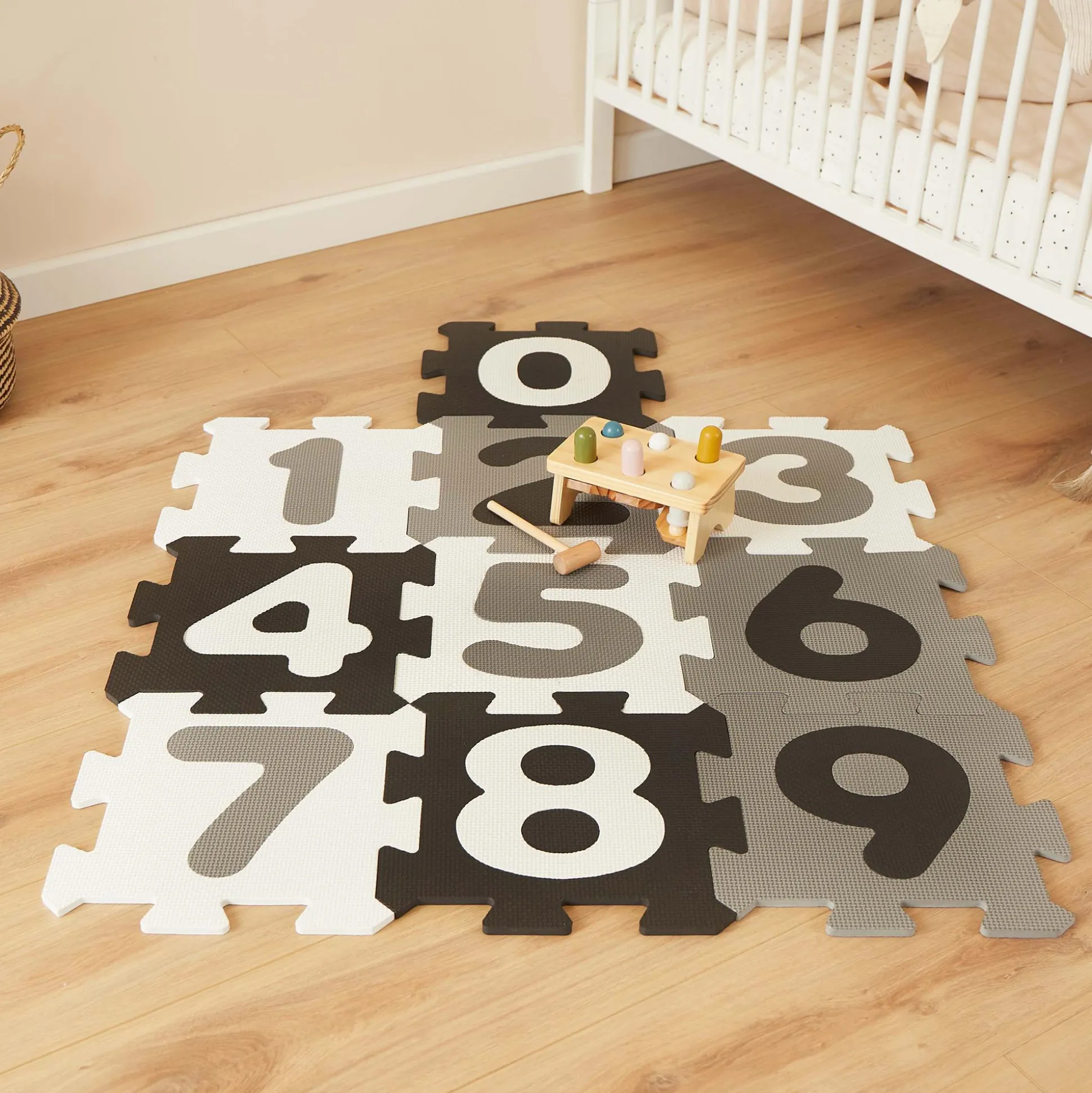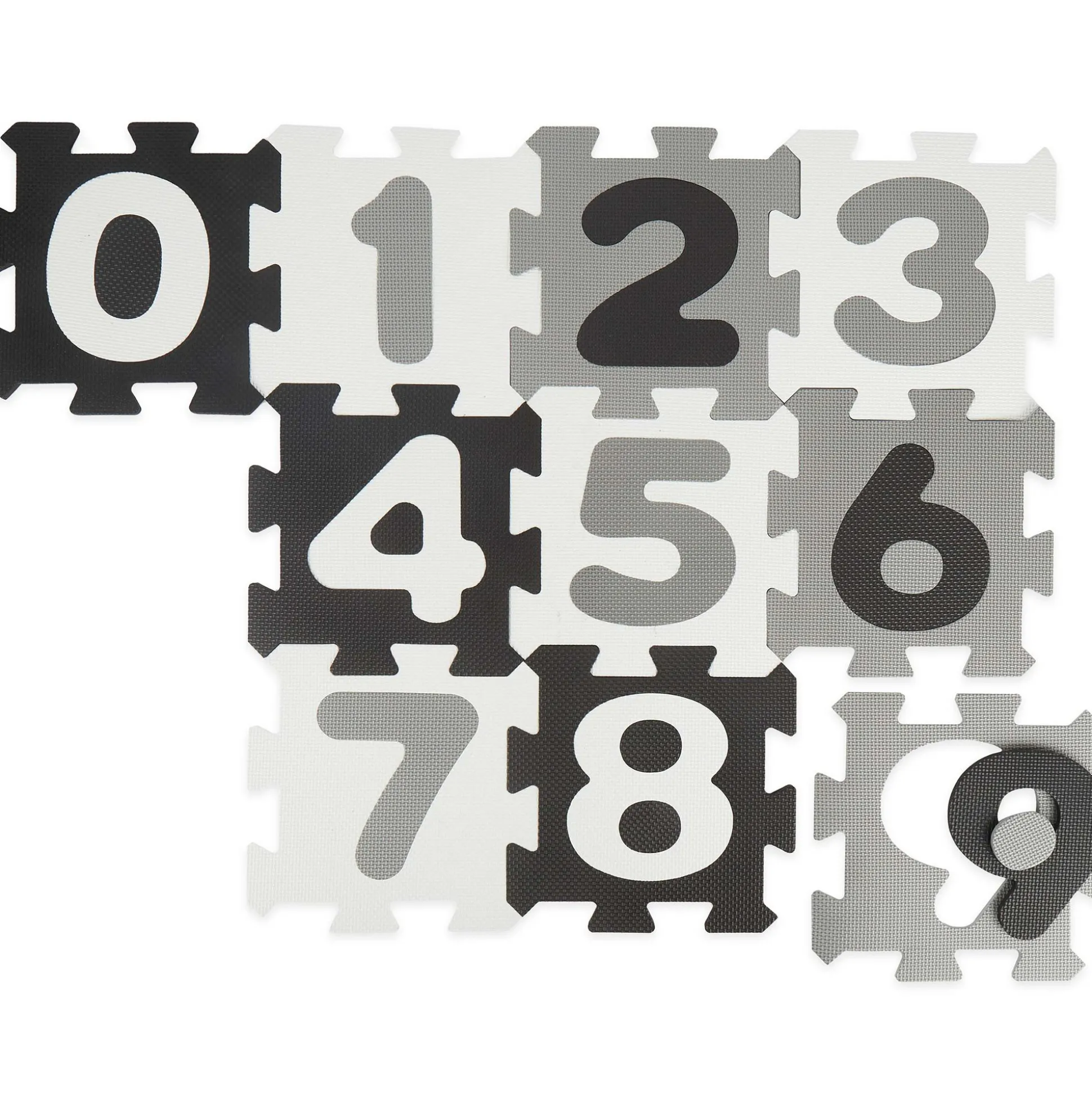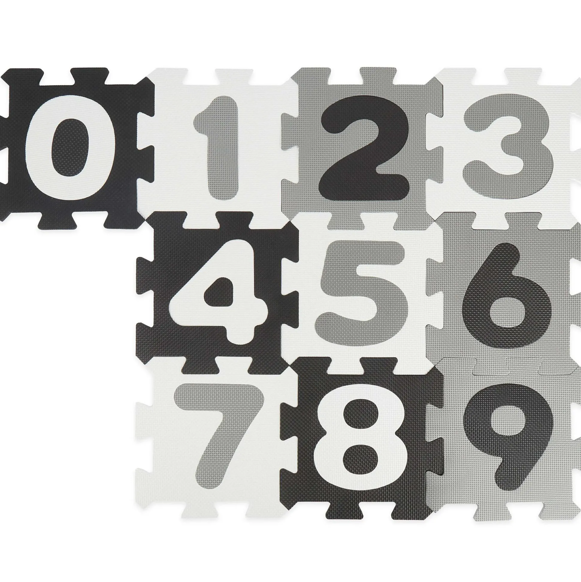 Die schwarz-weiß-graue Baby Puzzlematte mit Zahlen von 0-9 ist ein spaßiges Puzzle für Jungen und Mädchen. Beim Zusammensetzen und Auseinandernehmen wird das Denkvermögen und die Geschicklichkeit der Kleinen trainiert. Die Baby Spieldecke ist aus weichem Schaumstoff und schadstofffrei. Die Baby ist ein geeignetes Puzzle ab 6 Monaten, mit dem du deinem Liebling die ersten Zahlen näherbringst. Ein Zusammensetzen der Platten als Würfel ist ebenso möglich. Außerdem können die Zahlen aus der Mitte herausgetrennt und so einzeln zum Spielen verwendet werden.