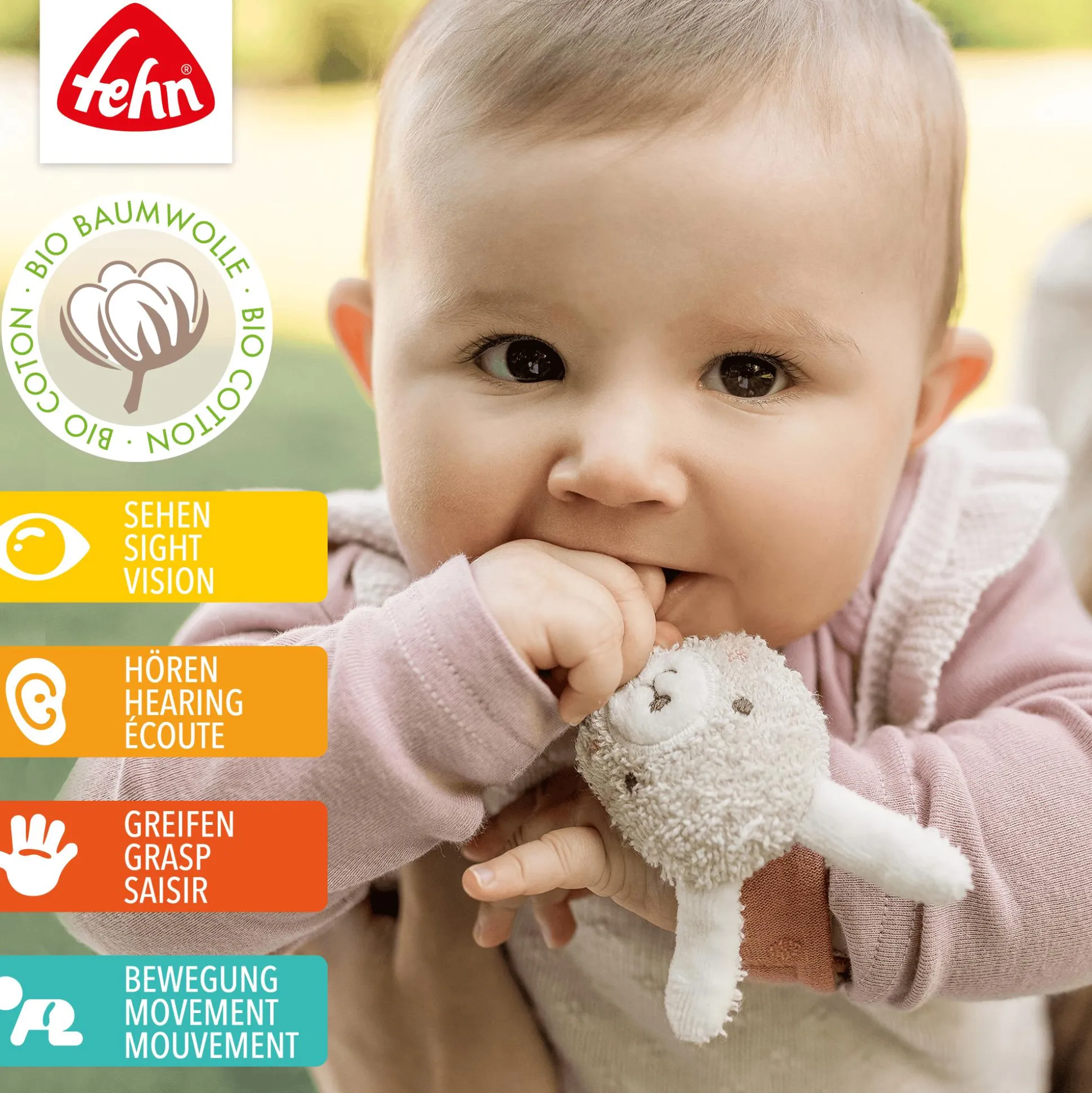 Das hübsche Rasselarmband mit Hase von fehn ist das perfekte Spielzeug, um die motorischen Fähigkeiten deines Nachwuchses spielerisch zu fördern. Das Armband wurde speziell für Babys und Kleinkinder ab der Geburt entwickelt und bietet eine Vielzahl von sensorischen Reizen.Das Spielzeug besteht aus hochwertiger Bio-Baumwolle in verschiedenen Varianten wie Frottee, Musselin, Jersey und Nicki. Diese Materialien fühlen sich angenehm weich auf der Haut deines Babys an und sind zudem nachhaltig und umweltfreundlich.Das Highlight des Armbands ist der niedliche kleine Hase, der ein toller erster Begleiter ist. Die Rassel im Inneren des Armbands sorgt für zusätzlichen Spaß und fördert das Hören deines Kindes. Bei jeder Bewegung des Arms wird ein angenehmes Rasselgeräusch erzeugt, das die Neugier und Aufmerksamkeit weckt.