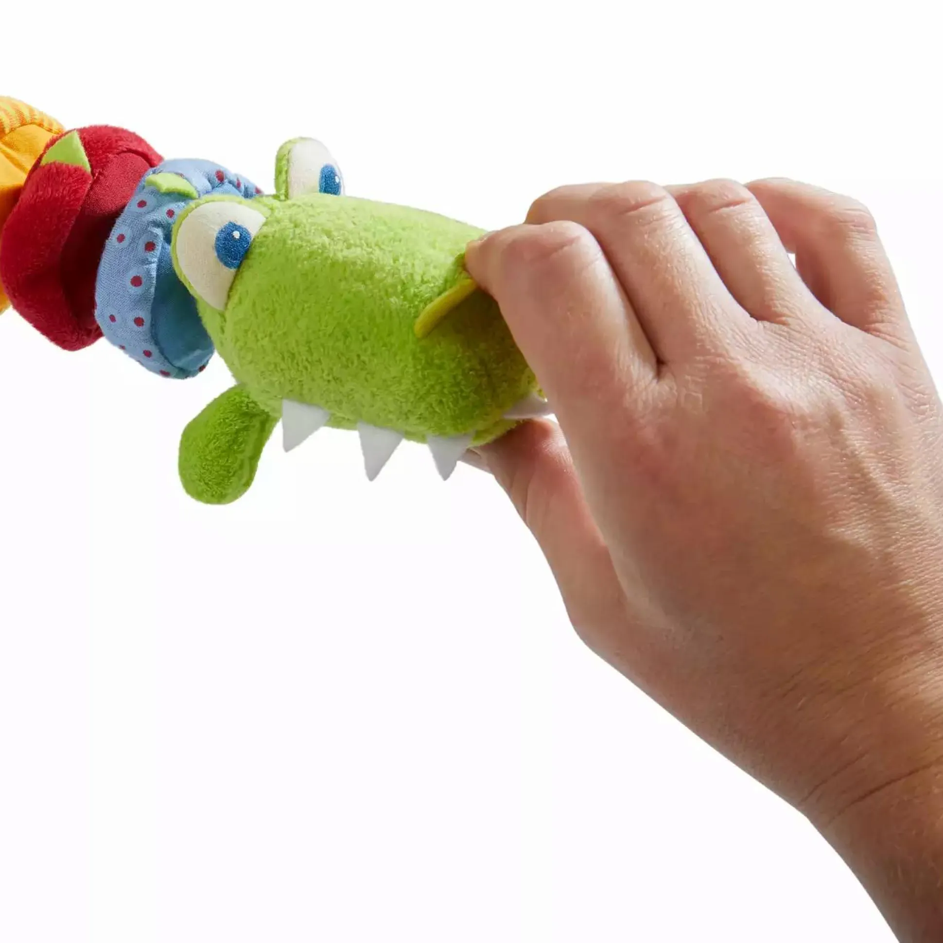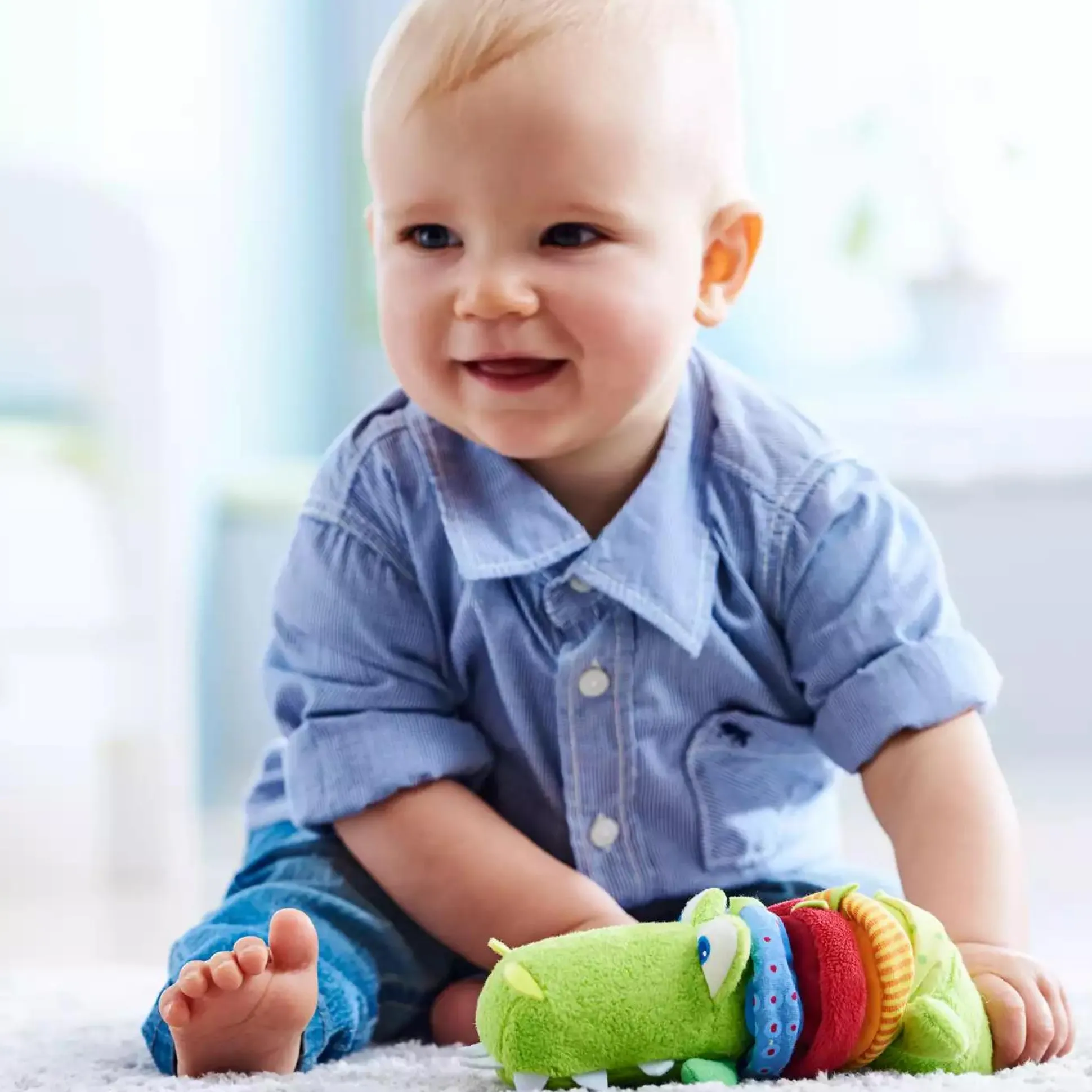 Dieses freundliche Krokodil ist ein lustiges Babyspielzeug und niedliches Kuscheltier in einem. Die Ratterfigur Kroko von Haba sorgt mit bunten Farben und lustigem Ratter-Effekt für jede Menge Spaß und gute Laune. Ziehen deine Kinder den gutmütigen Kroko an Schwanz und Kopf auseinander, rattert er munter in seine Position zurück. Dabei fördert er ganz spielerisch die Feinmotorik und regt mit unterschiedlichen Stoffen und Farben die Sinne an. Und haben die Kinder keine Lust mehr auf Geratter, wird das Haba Krokodil zum liebevollen Kuschelfreund.