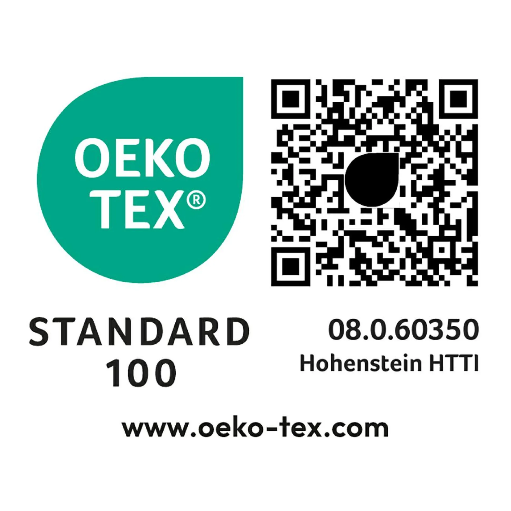 - Oeko-Tex Standard 100 – Zertifizierungsnummer: 08.0.60350 Hohenstein HTTI
