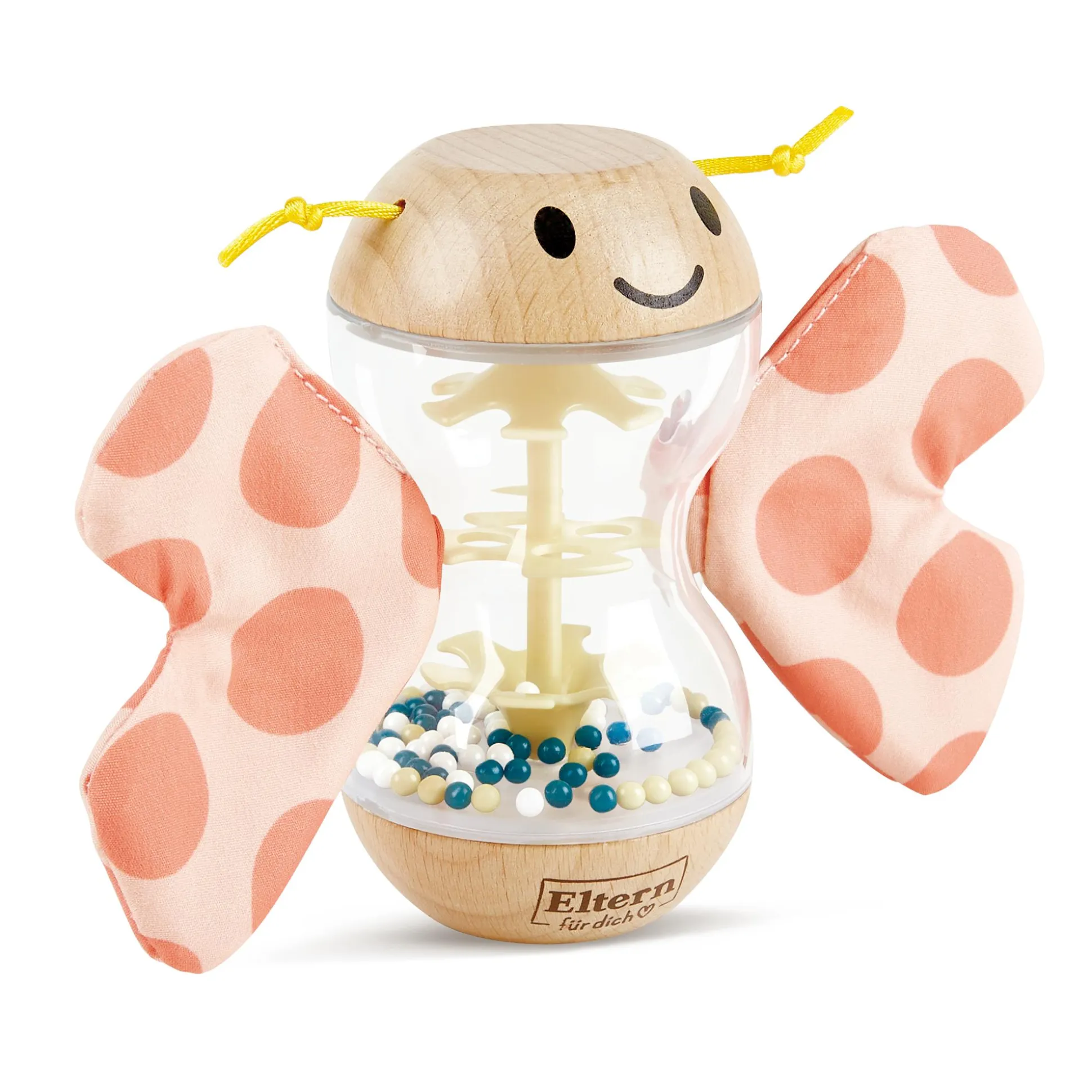 Rosalie ist nicht nur babygerecht, sondern auch besonders pflegeleicht gestaltet. Die Stoffflügel sind abnehmbar, sodass der Körper leicht zu reinigen und zu desinfizieren ist. Die glatte Holzoberfläche und der robuste Kunststoffkörper gewährleisten, dass die Rassel von kleinen Händen gehalten und sogar bedenkenlos in den Mund genommen werden kann.