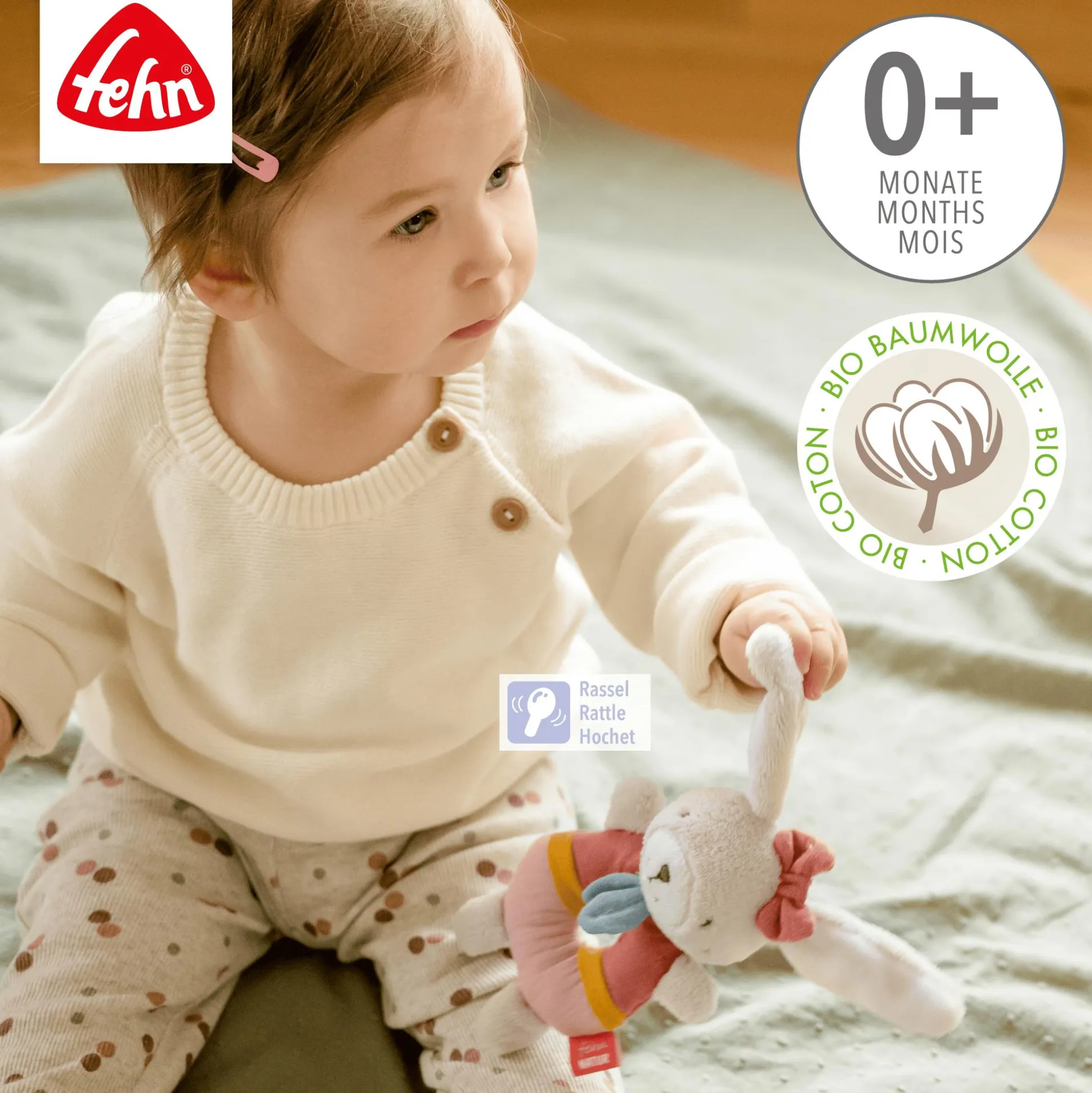 Der Ring-Greifling Hase von fehn ist ein wunderbares erstes Motorik-Spielzeug für deinen kleinen Liebling. Hergestellt aus Bio-Baumwolle aus kontrolliertem Anbau, ist es nicht nur umweltfreundlich, sondern auch sanft zur empfindlichen Haut deines Kleinen. Egal, ob im Bettchen, in der Babyschale oder im Kinderwagen, der Hase ist immer dabei und sorgt für fröhliche Momente. Mit seiner kuschelweichen Oberfläche und der angenehmen Rassel im Inneren weckt der Greifling Babys Entdeckergeist und fördert gleichzeitig den Greif- und Hörsinn sowie die Motorik.Kleine Entdecker werden schnell verstehen, wie sie den farbenfrohen Kuschel-Hasen zum Rasseln bringen können.