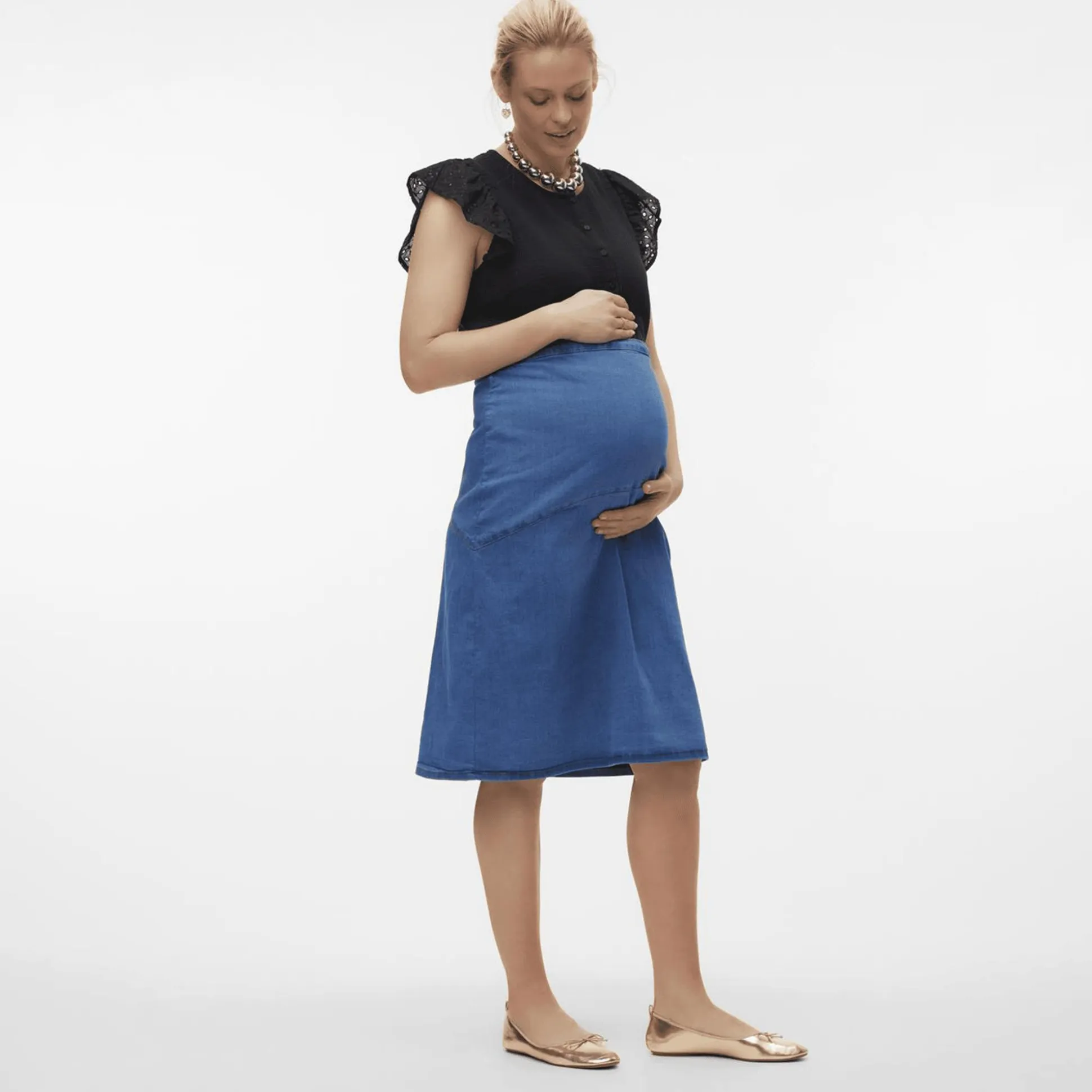 Kombiniere deine Lieblingsoberteile und Blusen mit diesem coolen Mamalicious Jeansrock Medium Blue Denim. Der knielange Umstands-Rock im sanft gewaschenen dunklen Denim-Look schmiegt sich perfekt an deinen wachsenden Bauch an und kreiert einen bequemen sowie luftigen Look, der immer passt. Der seitliche Reißverschluss erleichtert dir zudem das An- und Ausziehen und das Bauchband, das deinen Babybauch bedeckt, bietet zusätzlichen Komfort und Halt.