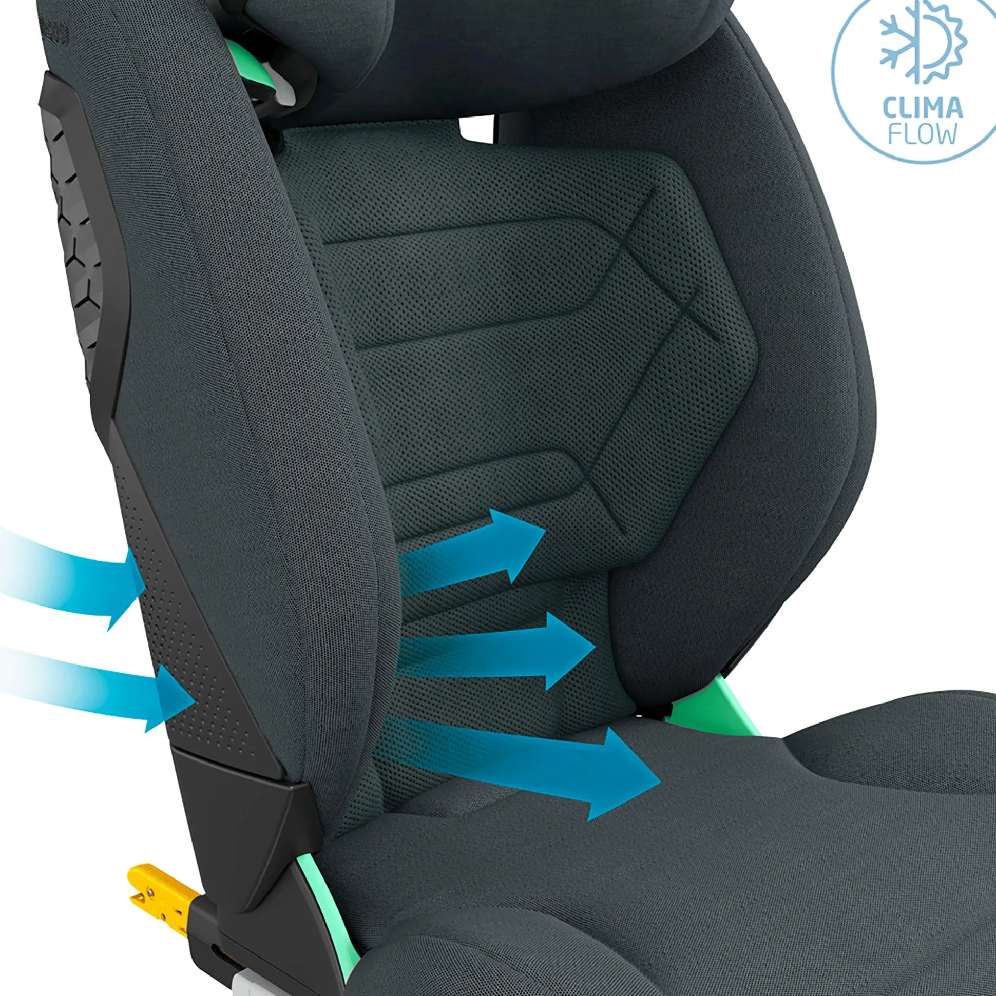Genauso progressiv präsentiert sich der – luxuriös gepolsterte – RodiFix Pro² i-Size in puncto Komfort: Während die – extra breite – verstellbare Rückenlehne für jede Situation die passende Sitz- oder Liegeposition ermöglicht, sorgen verbesserte ClimaFlow-Belüftungssysteme in Kombination mit atmungsaktiven Materialien für eine angenehme Luftzirkulation und damit für ein stets angenehmes Sitzklima.