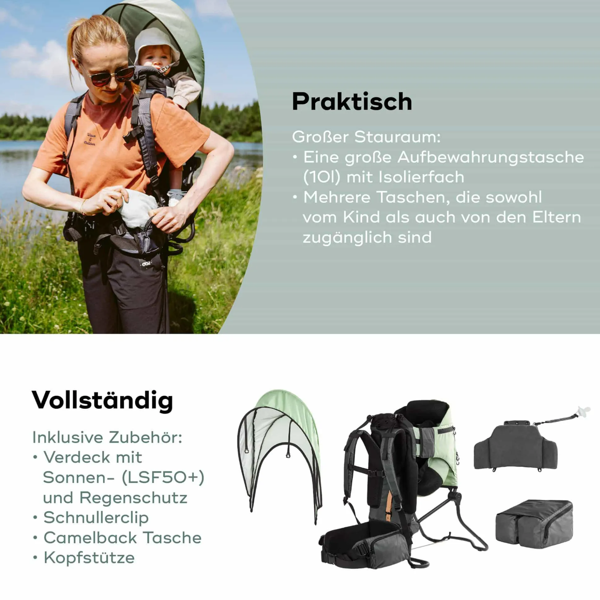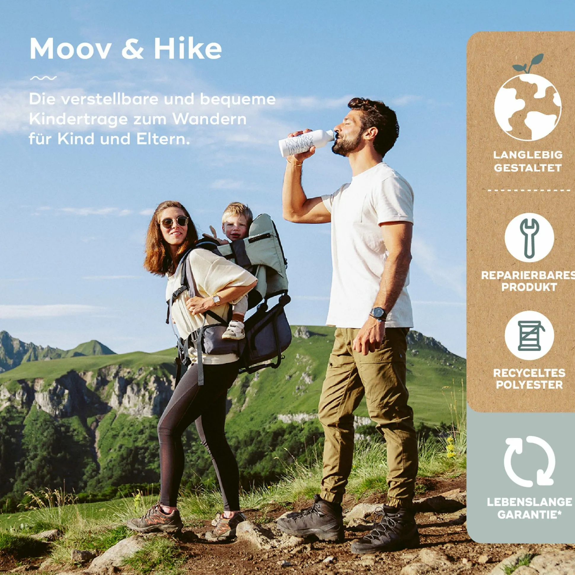 Eine 10-Liter-Aufbewahrungstasche mit isoliertem Fach sowie praktische Accessoires – wie Sonnenverdeck, Schnullerclip, Camelback-Tasche und Kopfstütze – runden das durchdachte Design ab. Hergestellt aus recyceltem, GRS-zertifiziertem Polyester vereint die Moov & Hike Nachhaltigkeit, Funktionalität und höchsten Tragekomfort – ideal für Familienwanderungen und Spaziergängen ab ca. dem sechsten Lebensmonat.