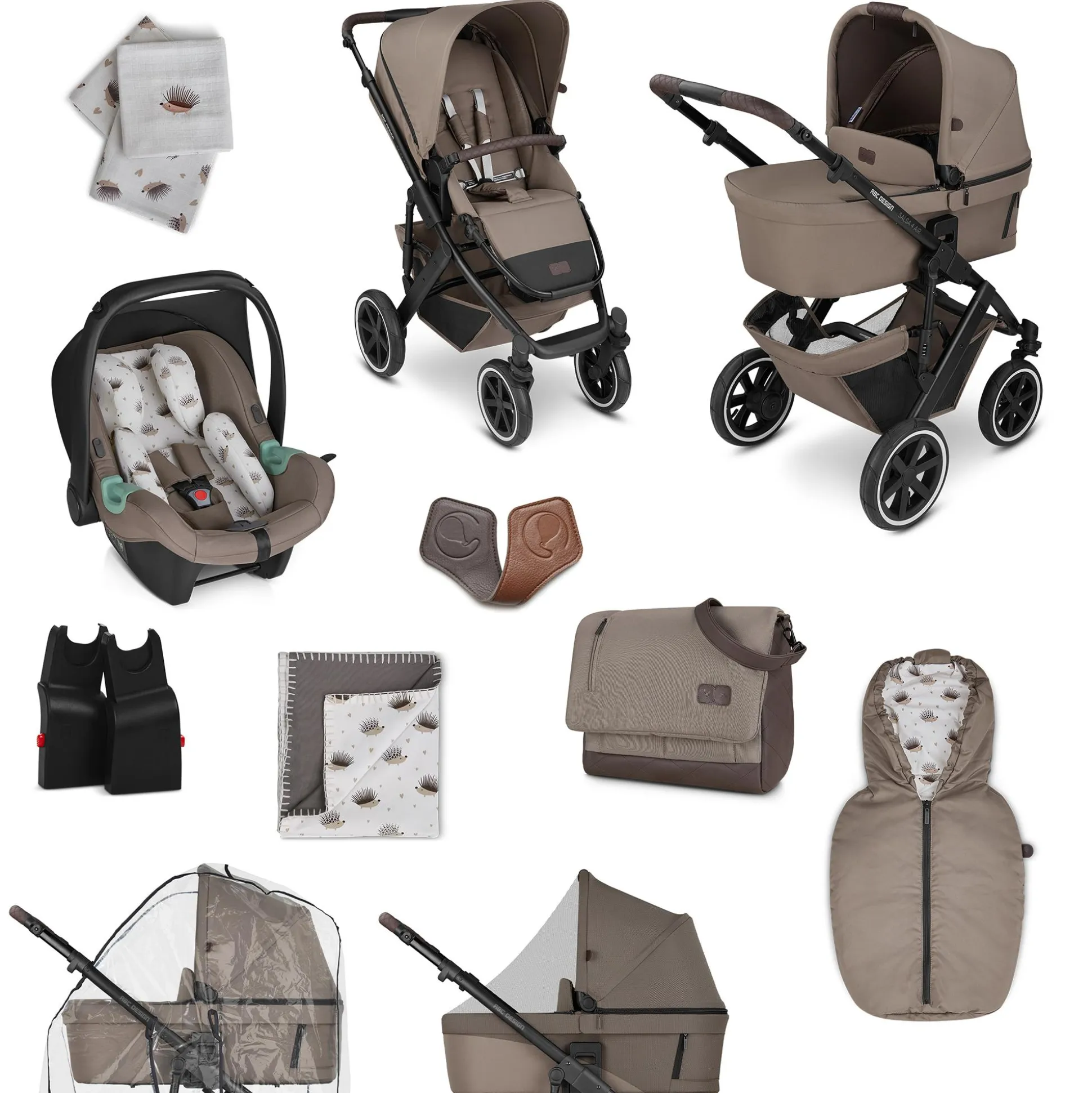 - bietet alles, was ihr braucht: Babyschale, Fußsack, Wickeltasche, Decke, Regenverdeck, Moskitonetz u. v. m.