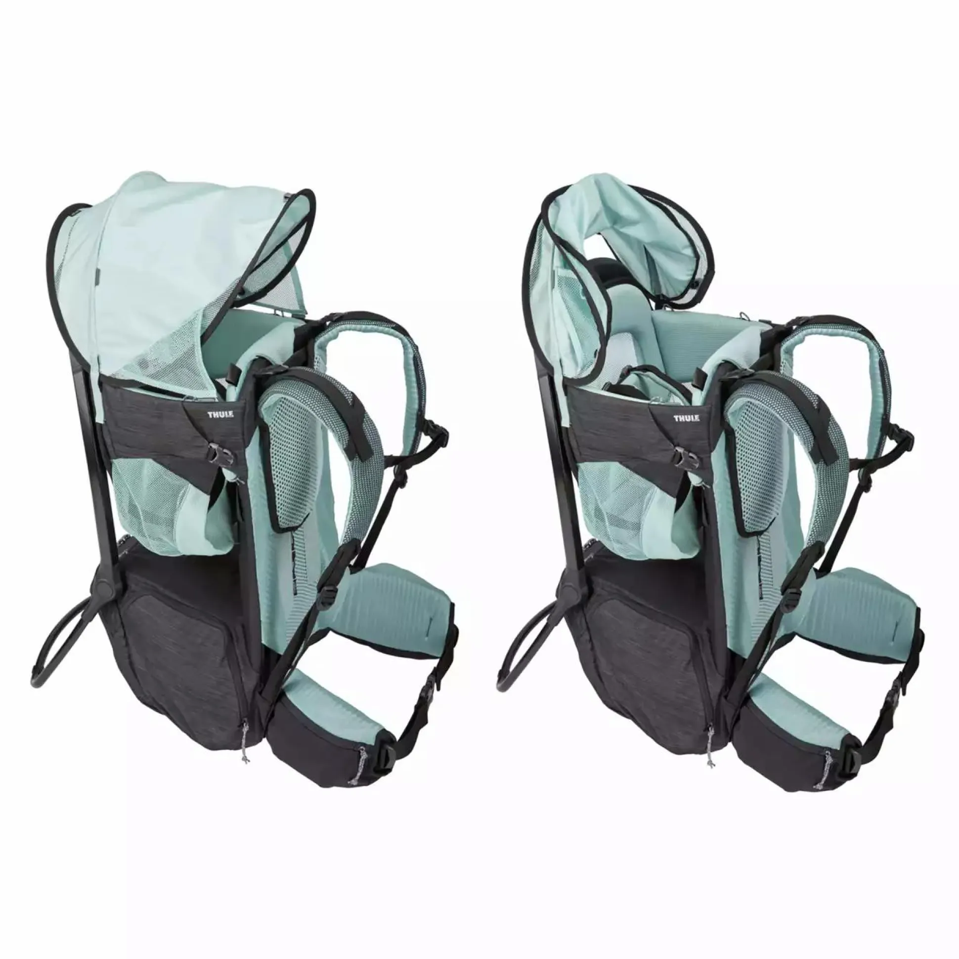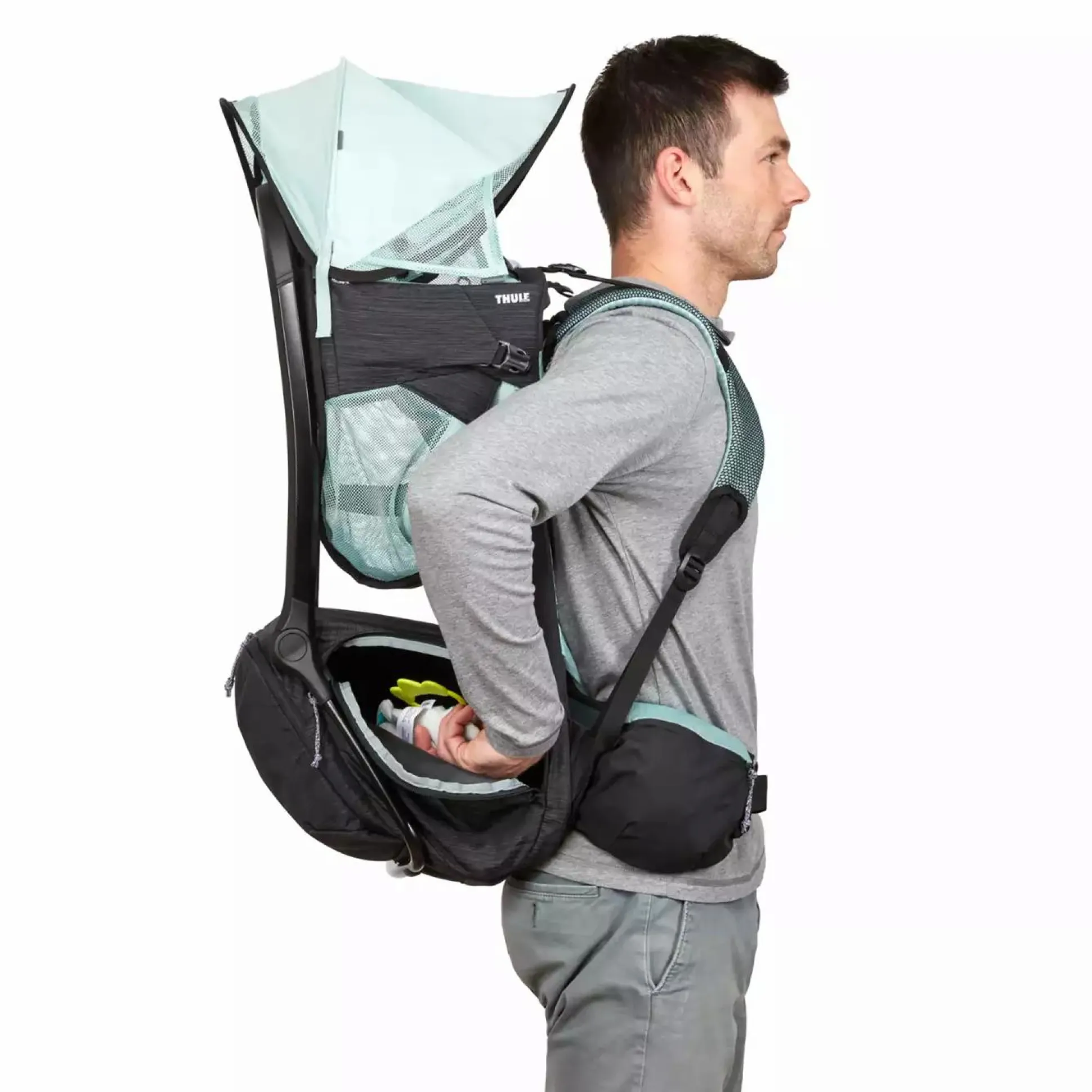 Die Thule Sapling verfügt über eine Unterschenkelstütze, einen verstellbaren Oberkörper- und Hüftgurt, die auch unterwegs verstellt werden können, so kann ganz einfach zwischen verschiedenen Trägern gewechselt werden. Viele wichtige Utensilien, wie Wasser, Windeln, etc., können verstaut werden. Das große Ausrüstungsfach lässt Platz für z.B. einen Wetterschutz (separat erhältlich). Der ergonomische Sitz sorgt mithilfe seiner belüfteten Rückwand für eine angenehme Gewichtsverteilung deines Kindes und ist zudem komfortabel und kühl – auch für dich. Du kannst dein Kind von oben in die Trage setzten oder es einfach selber von der Seite aus einsteigen lassen. Die Sonnenblende schützt vor Sonneneinstrahlung und verhindert, dass es zu warm für dein Kind wird.