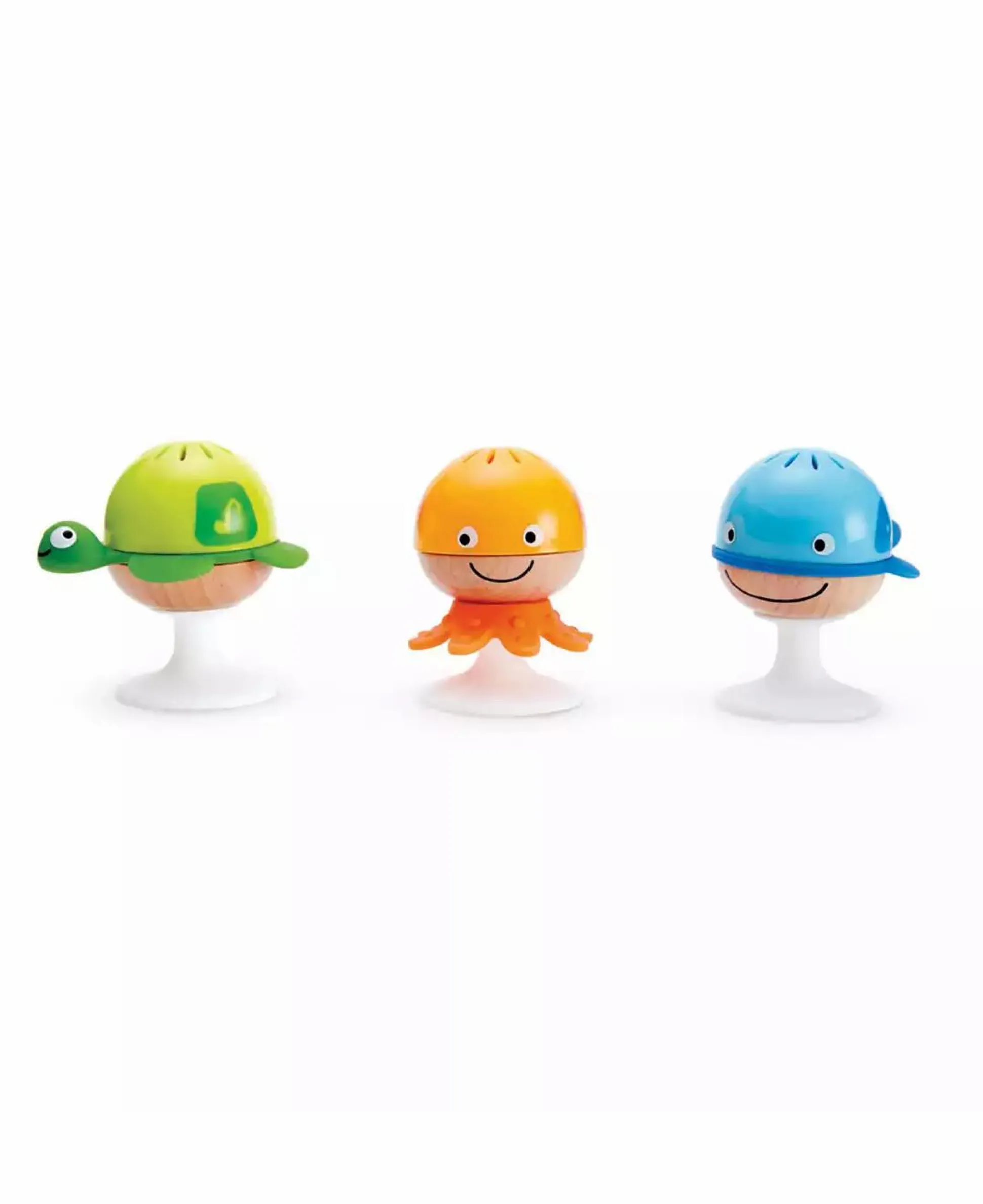 Die praktischen kleinen Rasseltierchen können mit einem Saugnapf ganz einfach am Tisch befestigt werden, sodass sie nicht verloren gehen und für anhaltenden Spielspaß sorgen.