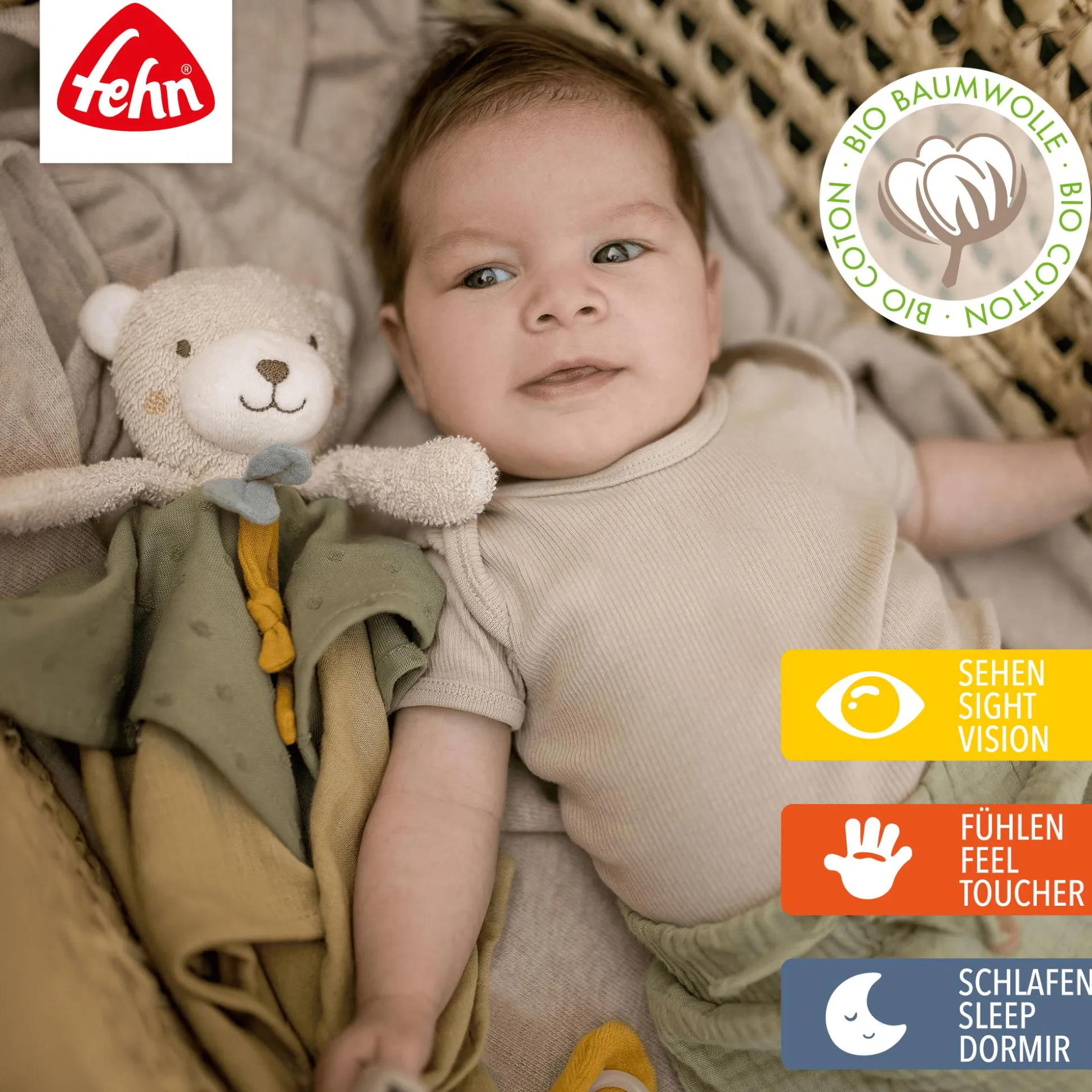 Beim Einschlafen spendet der grüne Kuschel-Bär Geborgenheit. Tagsüber laden die weichen Materialien im Lagen-Look zum Greifen, Fühlen und Knuddeln ein. Die Obermaterialien Frottee, Jersey, Musselin, Nicki und die Füllung des Schnuffeltuchs sind aus Bio-Baumwolle aus kontrolliertem Anbau (kbA).