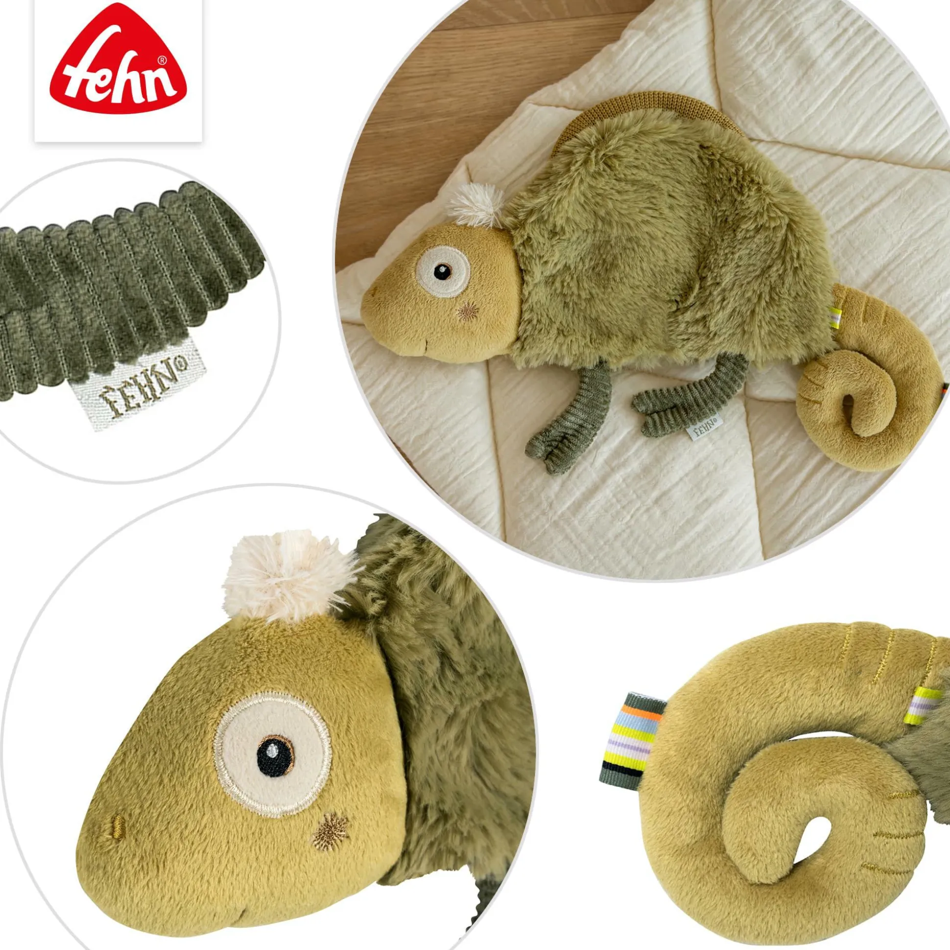 Das Schmusetuch Chamäleon von fehn begleitet dein Baby von Geburt an mit seiner kuschelig weichen Haptik und schenkt ihm Geborgenheit und Wärme. Dieses liebevoll gestaltete Schmusetuch in einem sanften Olivton lädt zum Greifen, Kuscheln und Schmusen ein und wird schnell zum treuen Begleiter in jedem Moment.