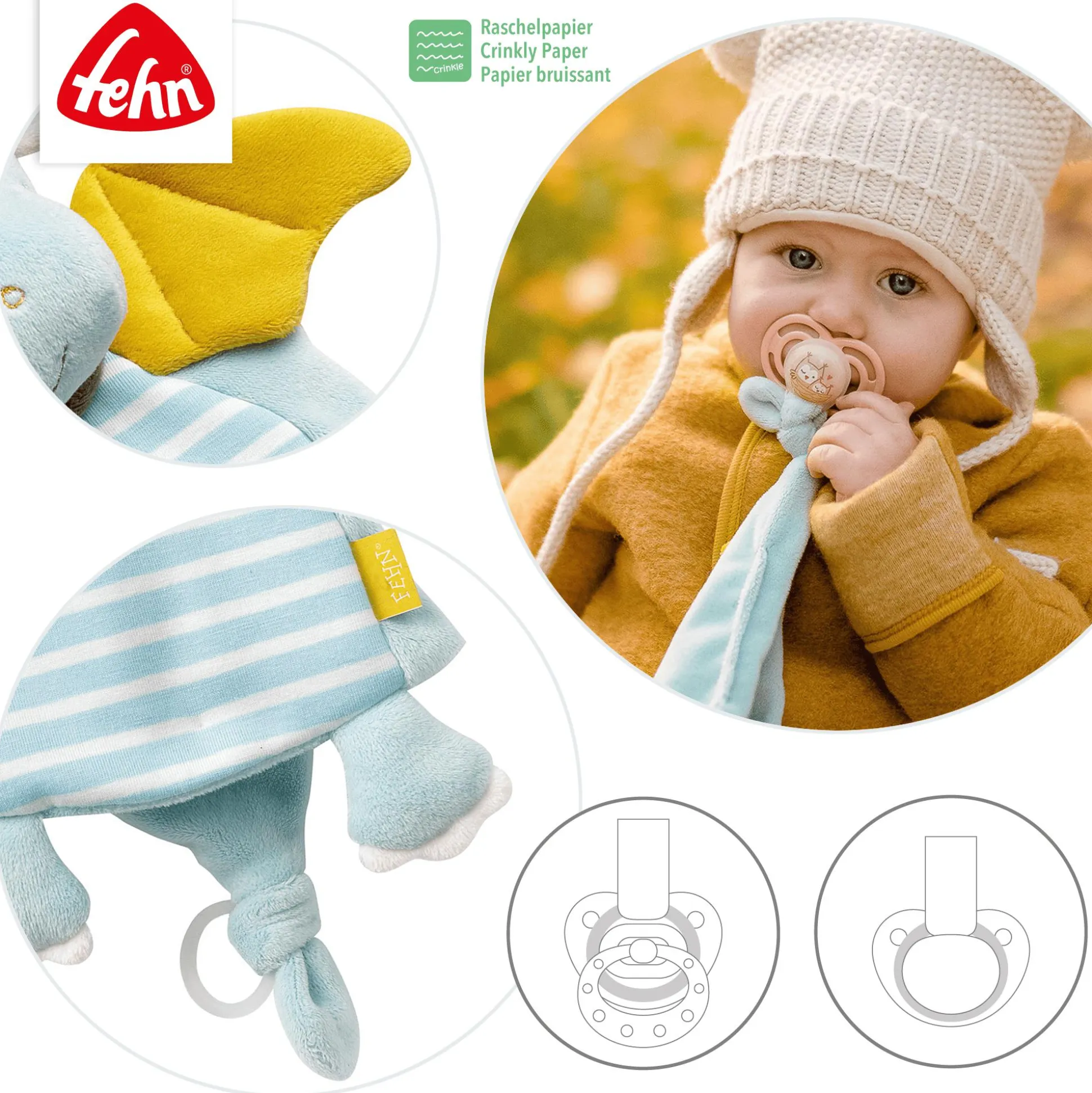 - dank des praktischen Befestigungsrings aus Silikon passen an das Schmusetuch alle Schnuller mit und ohne Henkel – so geht der Schnuller auch unterwegs nicht verloren