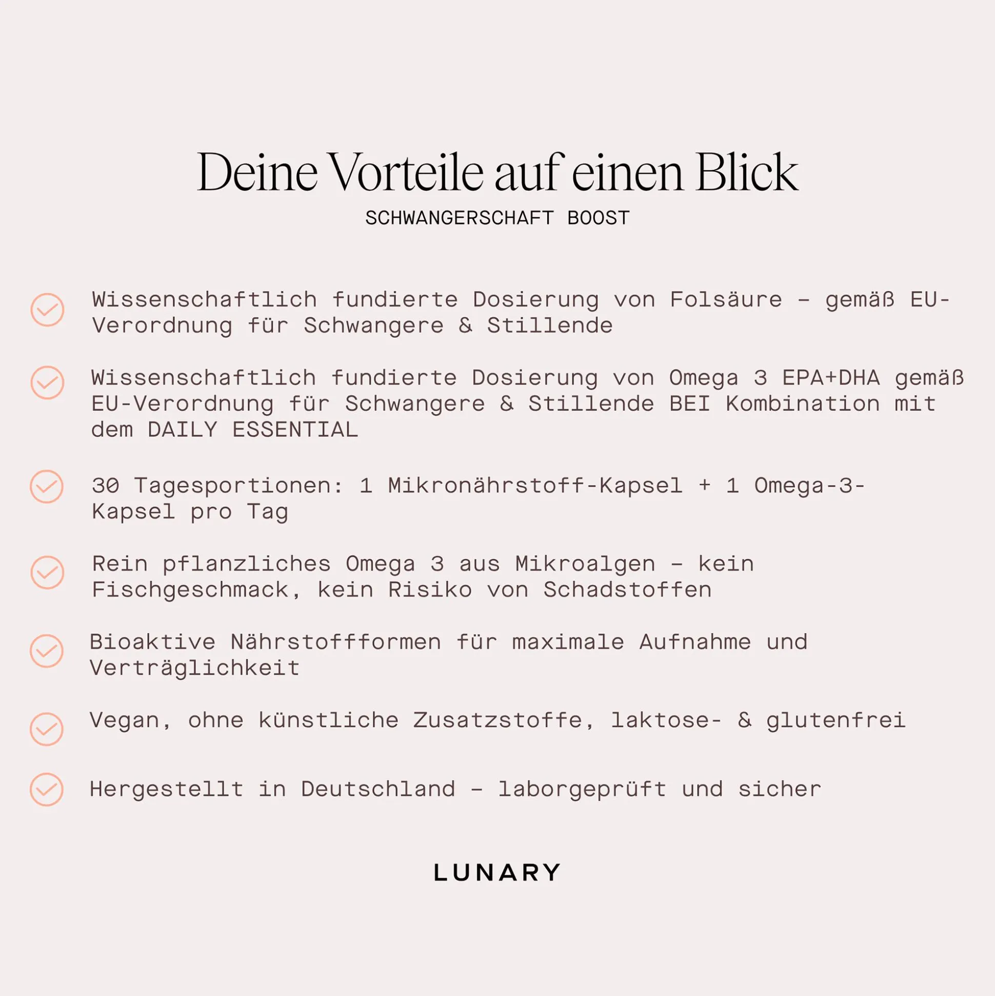 Der Schwangerschaft Boost von Lunary wurde speziell für die besonderen Bedürfnisse von Frauen in der Schwangerschaft entwickelt – für dich und dein Baby. Diese durchdachte Kombination aus essenziellen Mikronährstoffen und pflanzlichem Omega 3 begleitet dich sanft durch diese aufregende Zeit und sorgt für eine optimale Nährstoffversorgung auf höchstem Niveau.