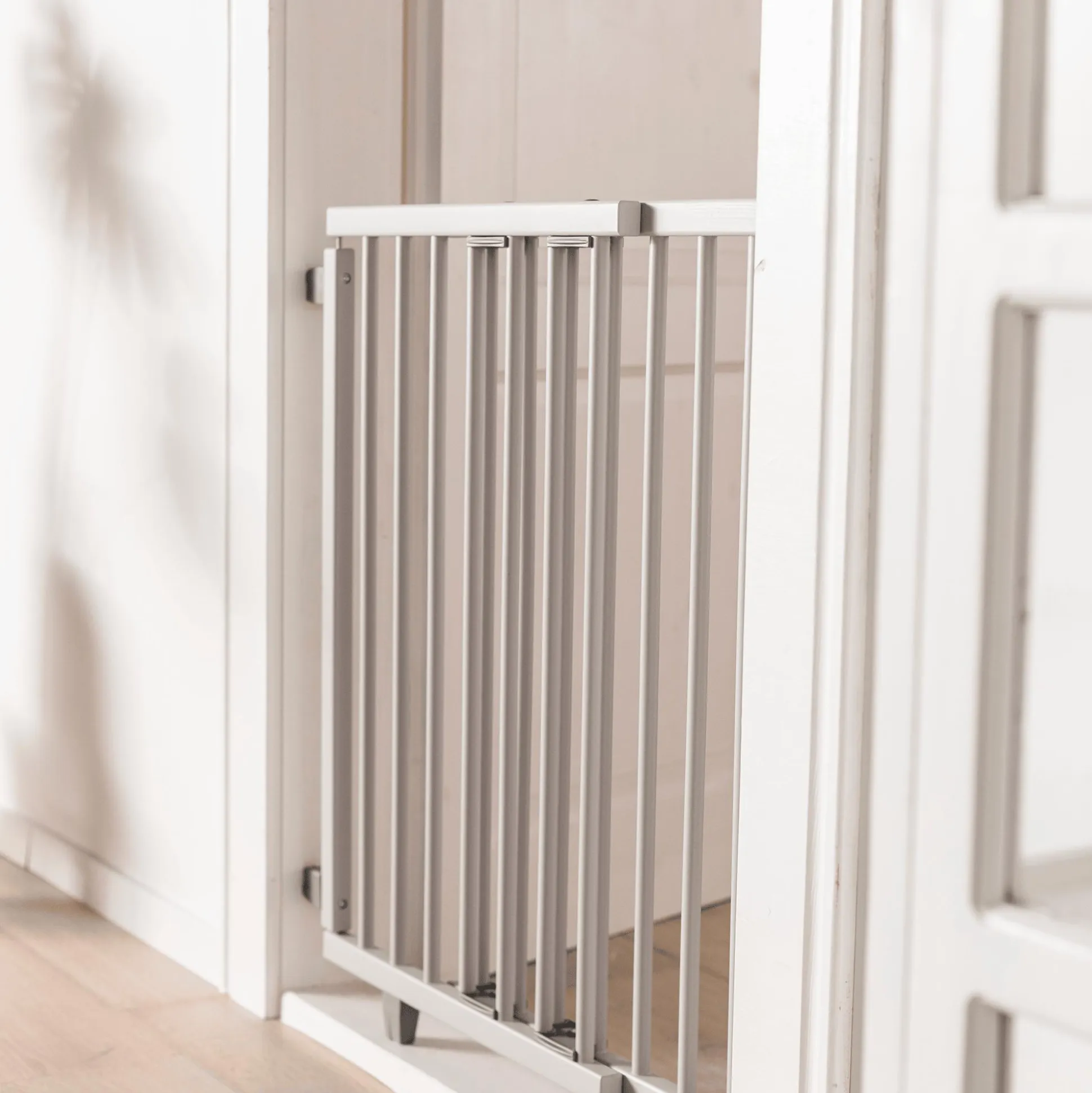 Das weiß lackierte Geuther Schwenk-Türschutzgitter Plus 2732 + setzt dort sichere Grenzen, wo Kind und Kegel nicht alleine durch, hinein oder hinaus sollen. Es wird fest im oder neben dem Türrahmen verschraubt. So sind die Kleinen auf der sicheren Seite und die Größeren haben per Riegel und Schwenkmechanismus ein leichtes Durchkommen. Auch als Hundegrenze ist es perfekt einsetzbar!
