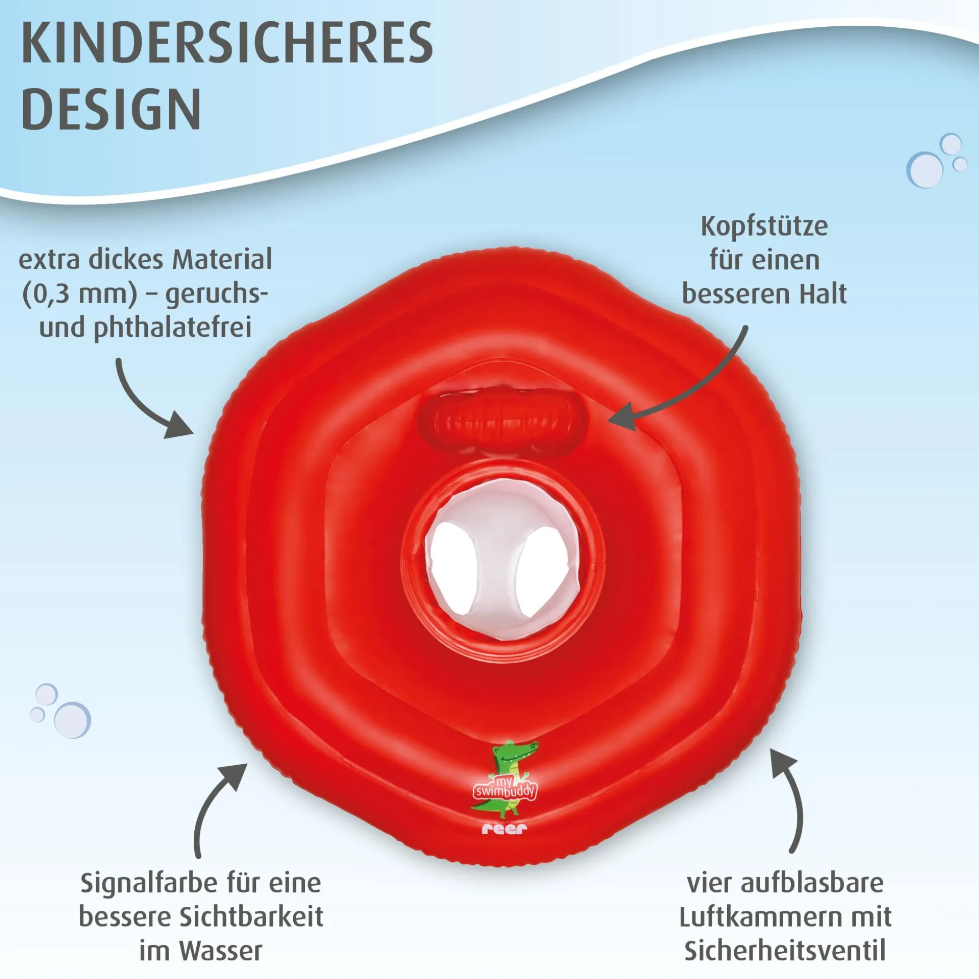 Der Schwimmsitz myswimbuddy von reer bietet deinem Baby mit seiner Netz-Sitzhose und der Kopfstütze sicheren Halt im Wasser. Vier aufblasbare Luftkammern mit Rückschlagventil sorgen für Stabilität, während dein Kind sanft ans Wasser gewöhnt wird. Leicht zu verstauen und ideal für Babys von etwa sechs bis 12 Monaten bis ca. elf Kilogramm.
