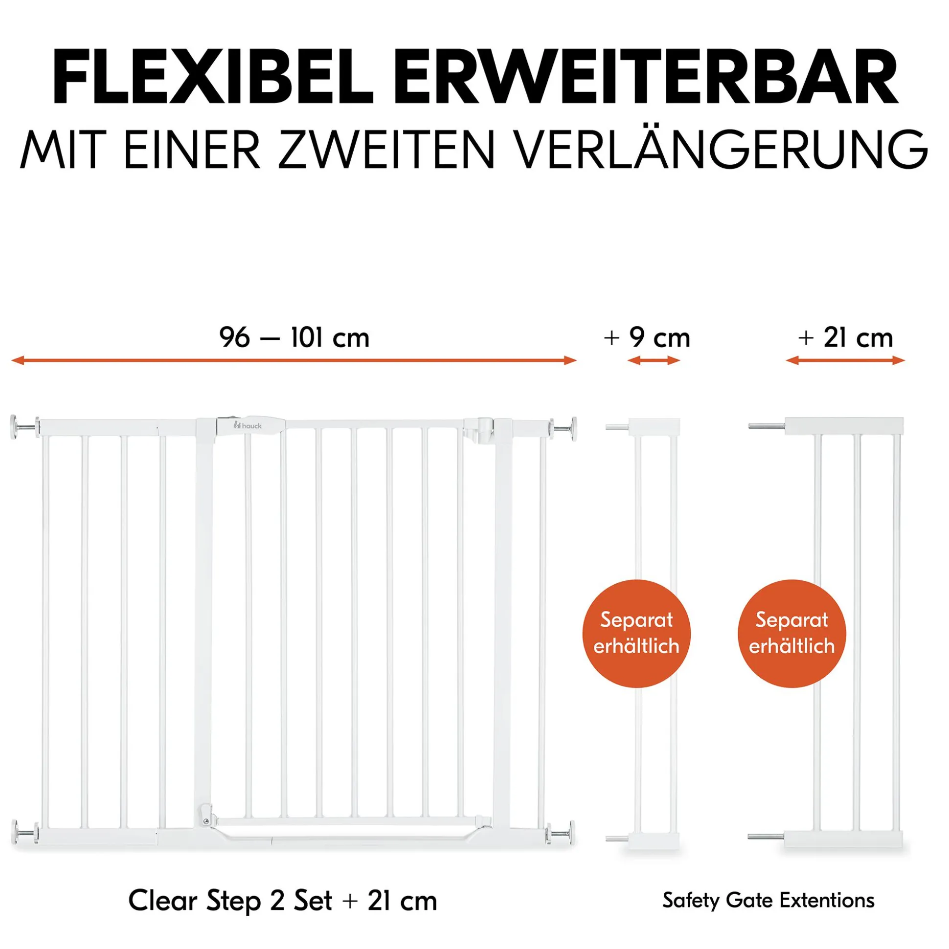 Das hauck-Set Clear Step ist nicht nur für Durchgänge mit einer Standardbreite von ca. 96-101 cm geeignet, sondern kann durch die separat erhältlichen Verlängerungen von 9 cm und 21 cm auf bis zu 122 cm erweitert werden. Mit separaten hauck Y-Spindeln kann das Absperrgitter auch an Treppen mit Rundholmen montiert werden.