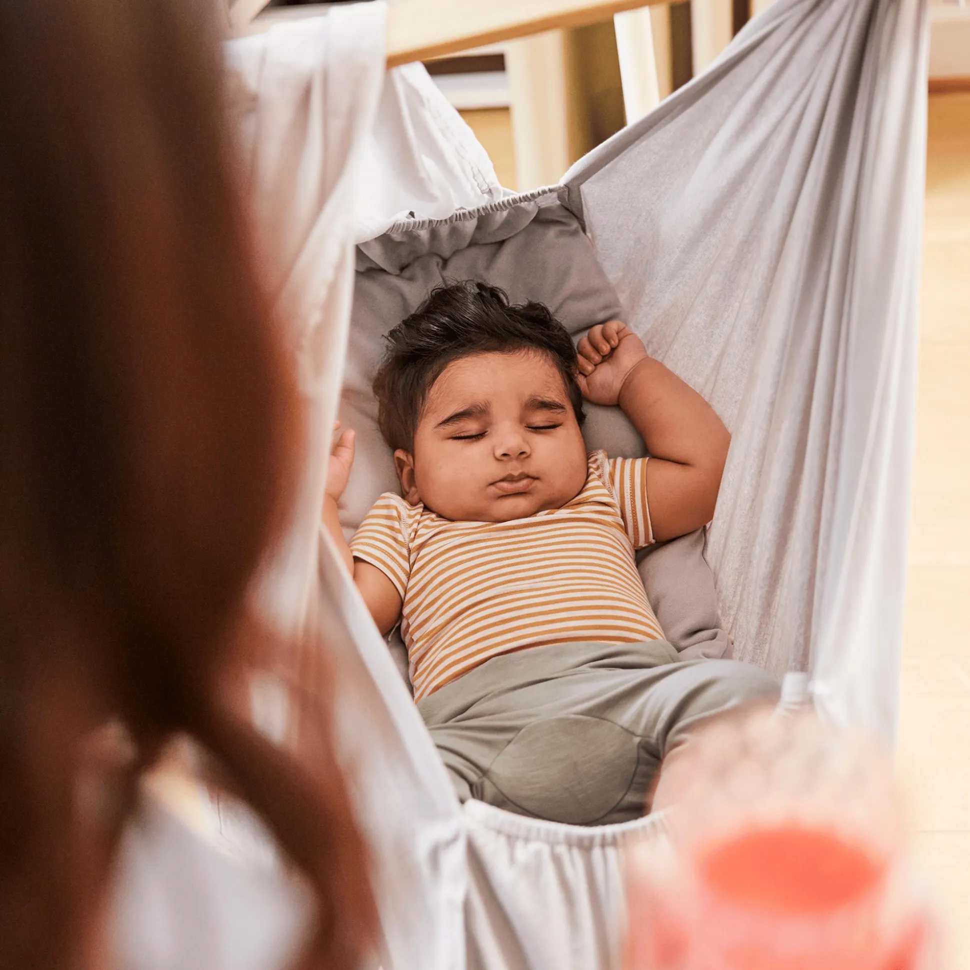 Die Federwiege Premium Grau von Membantu ermöglicht deinem Kind einen ruhigen Schlaf. Sie ist aus 100% Bio-Baumwolle hergestellt, die sich sanft um dein Baby schmiegt und ihm ein Gefühl von Geborgenheit gibt. Der Baldachin schützt dein Kind vor verschiedenen Sinneseindrücken und sorgt so für einen möglichst ruhigen Schlaf. Die Federwiege erinnert außerdem an den Mutterleib – so kommt dein Baby schneller zur Ruhe und kann entspannen.