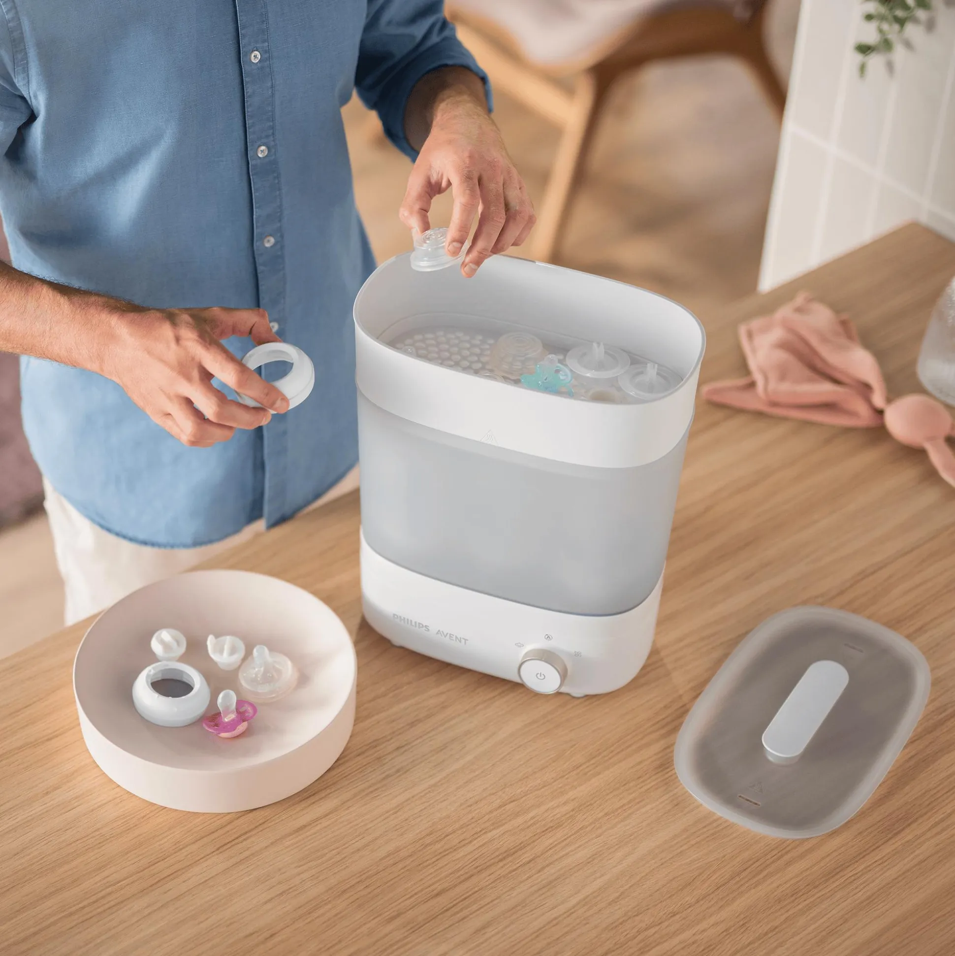 Der elektrische Flaschensterilisator und – trockner SCF 293/00 von Philips Avent tötet in kürzester Zeit 99,9 % aller schädlichen Bakterien ab. Fläschchen, Milchpumpe und Zubehöre werden so auf einfachste Weise in nur 40 Minuten hygienisch sauber und trocken. Dank platzsparendem Design bietet das intelligente Gerät flexibles Fassungsvermögen bei minimalem Platzanspruch in der Küche. Außerdem lässt sich der Sterilisator ganz einfach reinigen und auch wieder zusammensetzen.