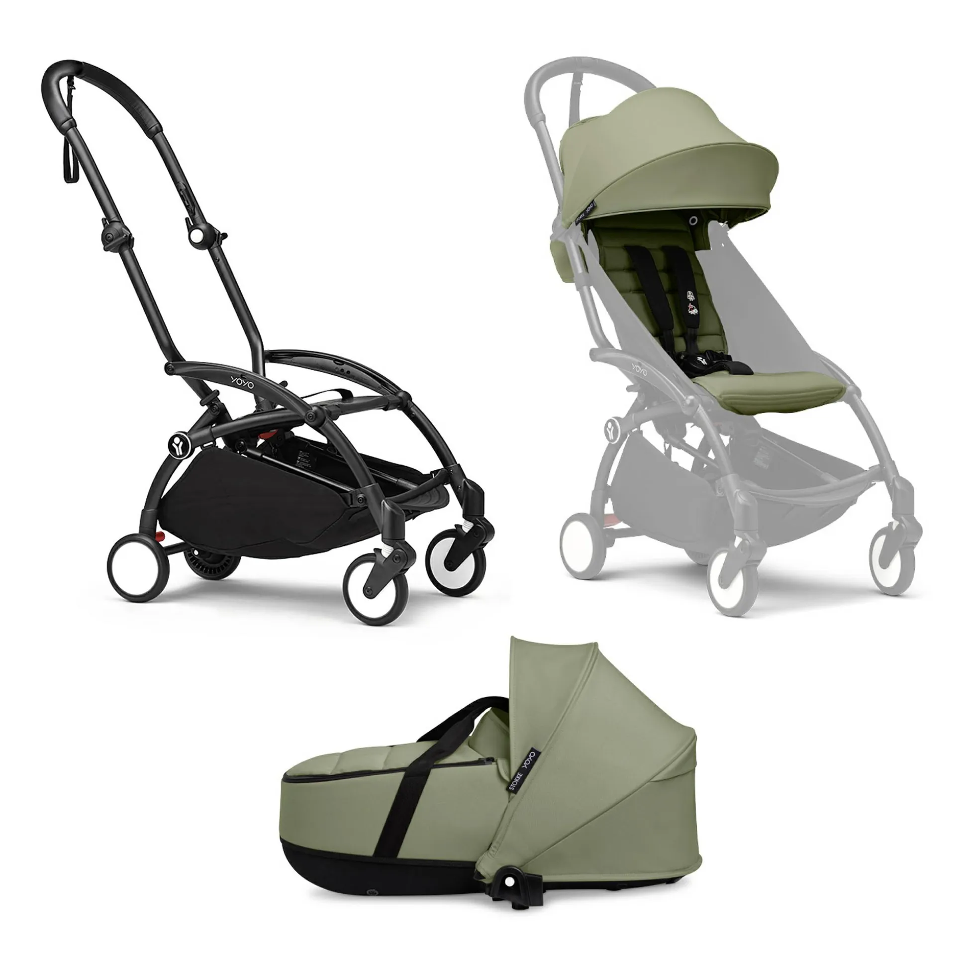 Dieses praktische Set besteht aus dem YOYO³ Gestell Black, der 0+ Liegewanne und dem 6+ Farbpaket von Stokke.