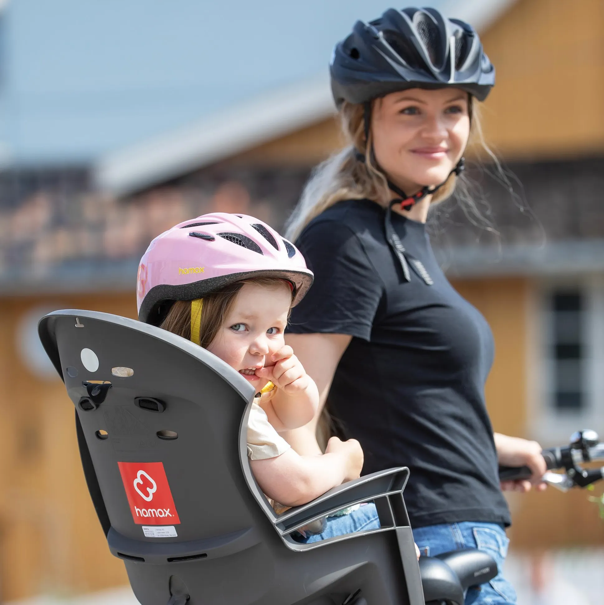 Die Schulterpolster sorgen für Komfort und erleichtern das Anlegen des Sicherheitsgurts. Die Fußstützen sind ebenfalls verstellbar. Für zusätzliche Sicherheit und besonders gute Sichtbarkeit sorgen außerdem die Reflektoren an der Rückseite des Fahrradsitzes von Hamax.
