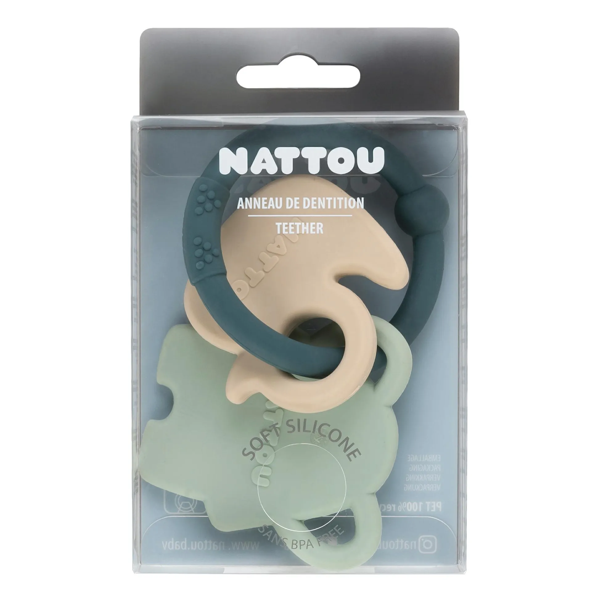Die Silikon-Kollektion bietet schlichte und elegante Designs – hergestellt aus hochwertigen Materialien und mit raffinierter Verarbeitung. Der Beißring mit den kleinen Tieren begleitet dein Baby, wenn die ersten Milchzähne zu wachsen beginnen. Die unterschiedlich strukturierten Oberflächen laden Babys zum Kauen ein und lindern so schmerzendes Zahnfleisch. Der Nattou Beißring ist für kleine Händchen leicht zu greifen und kann auch einfach zum Spielen benutzt werden.