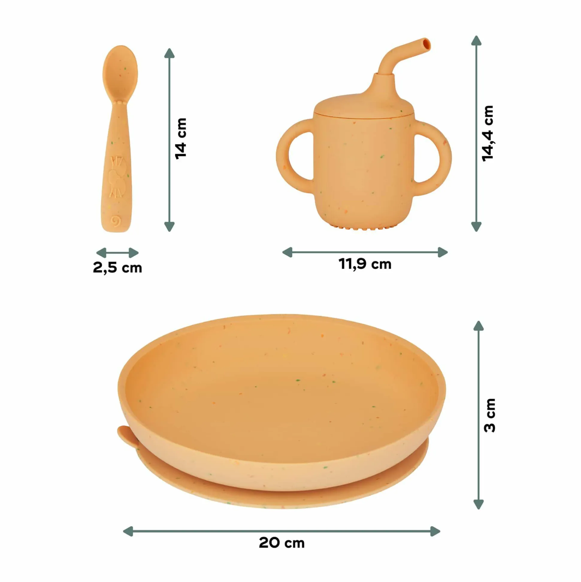 - bestehend aus Teller mit Rand, 3-in-1-Trinkbecher mit Strohhalm und abnehmbarem Deckel, Kinderlöffel